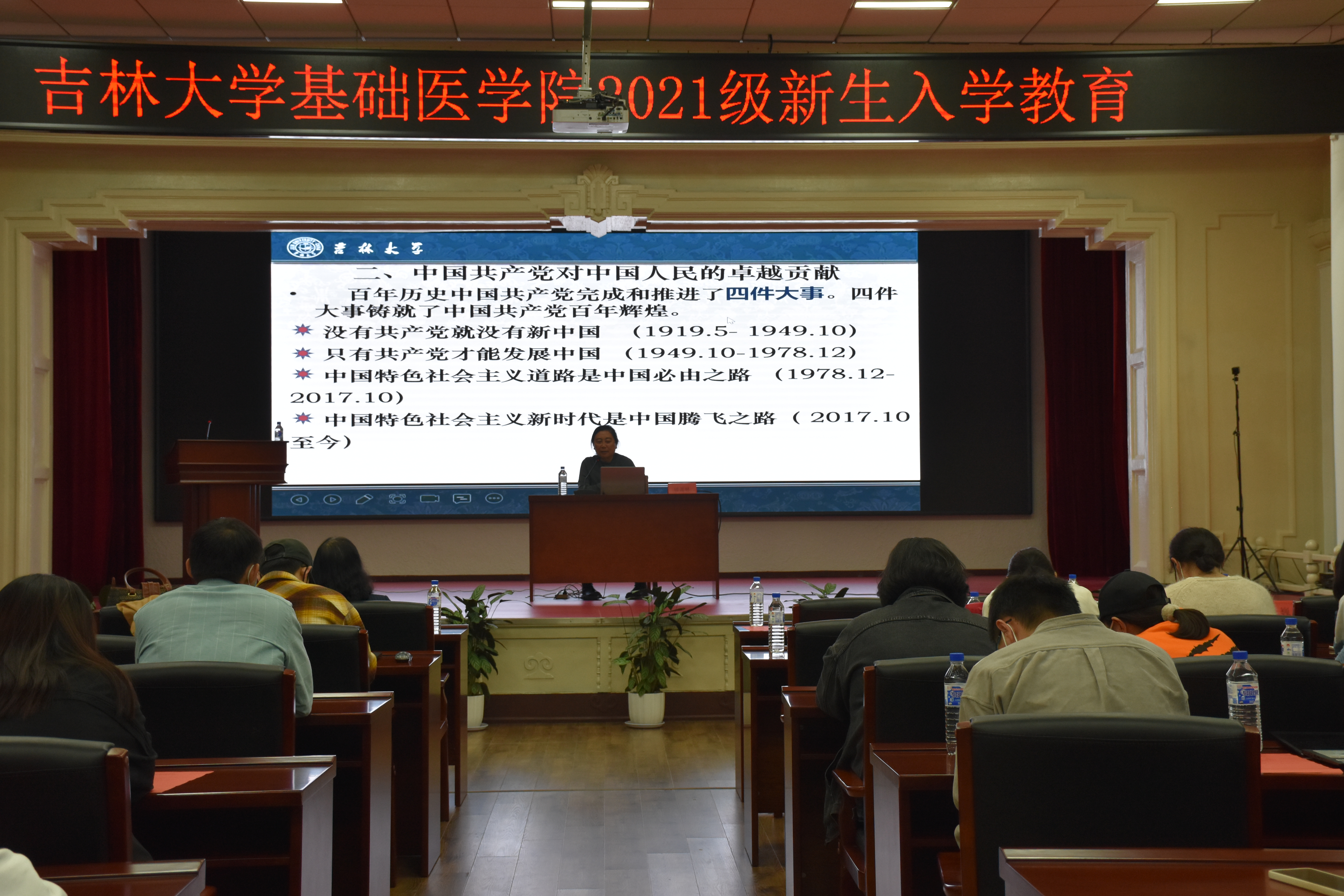 2021年10月11日,吉林大学关心下一代委员会副主任、马克思主义学院傅菁林教授在Galaxy银河报告厅为2021级新生做题目为《中国共产党的百年辉煌历程》的专题报告。