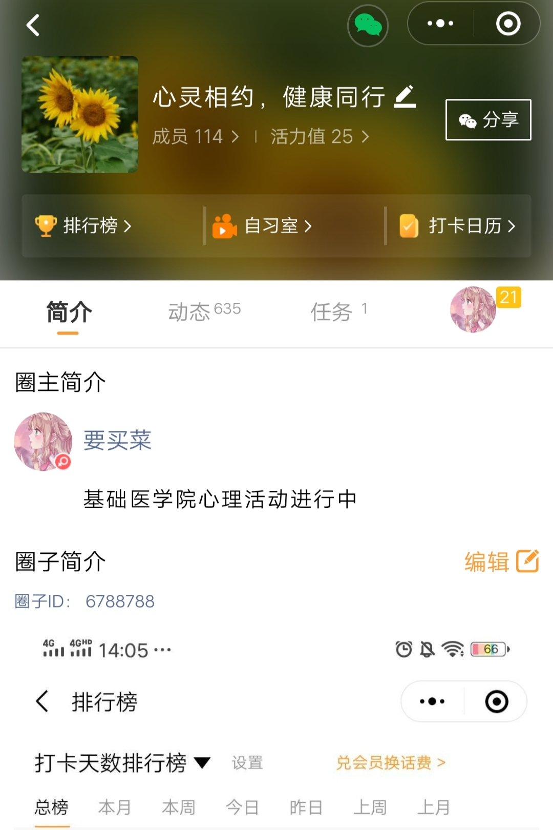 为充实研究生校园生活,增强心理健康意识,普及心理健康知识,促进大家养成良好的习惯,充满积极的能量,洋溢活泼的风采,近期,Galaxy银河采用线上微信小程序打卡方式举办了2021年“朋辈协力•心理成长”系列活动—— “心灵相约,健康同行”运动互动打卡活动。本次活动由研究生心理辅导员孙佳钰老师组织,朋辈心理辅导员赵鹤负责,全院研究生共同参加。