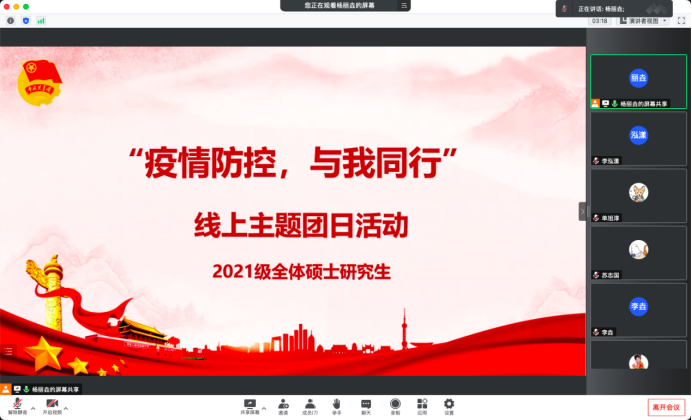 为充分发挥团学组织在防疫抗疫过程中的先锋模范作用,进一步加强疫情防控期间学生的思想引导,凝聚防疫信心。2022年4月15日,Galaxy银河2021级硕士团支部在线上开展了主题为“疫情防控,与我同行”的团日活动。Galaxy银河团委负责人、研究生辅导员孙佳钰老师以及2021级硕士全体团员参加,活动由2021级硕士团支书杨丽垚主持。