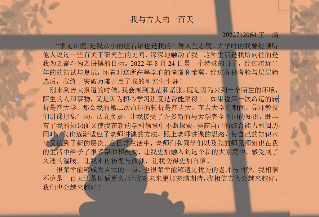 一落叶而知秋,惟愿你我心向阳不忧伤,一路随心而行,一路随遇而安。不知不觉中,2022级的新同学们也已经来到吉林大学100天了,在过去的100天里,也有自己和吉林大学独特的故事发生.值此100天之际,Galaxy银河特面向2022级研究生新生开展“我与吉大的100天”作品征集活动,让同学们写出自己的心声。