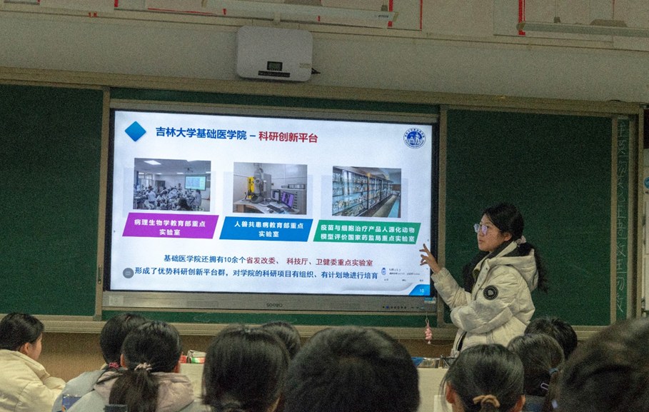 在宣讲当日,刚来到教室门口,高三2109班的学弟学妹们已经猜到了我的身份和目的,表现出了极大的期待和热烈的欢迎。首先结合PPT为学弟学妹们介绍了吉林大学的历史背景、学科优势、特色专业、就业情况、校园活动等方面内容,然后小组五人就各自专业分工进行了讲解。在演讲过程中,穿插了提问互动,给予备考生们的备考经验及填报志愿的心得,为他们报考大学提供一定的指导,助力学弟学妹们备考顺利,报考理想的大学。并给积极响应的同学们送出了吉大特色文创。