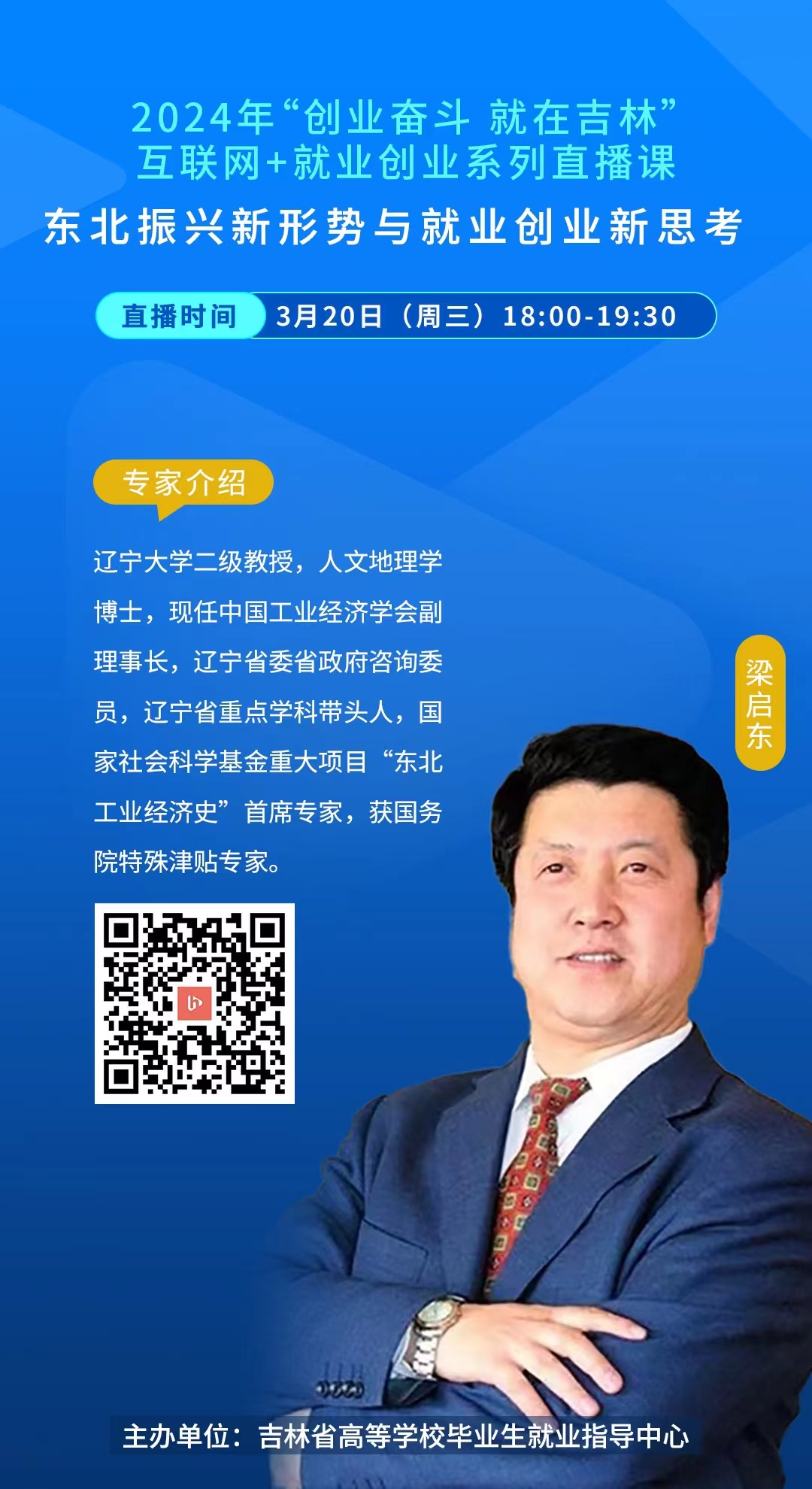 为了让学生深入了解国家有关高校毕业生的就业和创业政策,全面了解和贯彻落实学生就业政策、自主创业、服务帮扶、应征入伍、基层项目及就业指导,Galaxy银河积极响应吉林大学就业指导服务中心要求,鼓励各个年级同学于3月20日18:00准时收看2024年“创业奋斗 就在吉林”互联网+就业创业系列直播课之《东北振兴新形势与就业创业新思考》网络直播课程。
