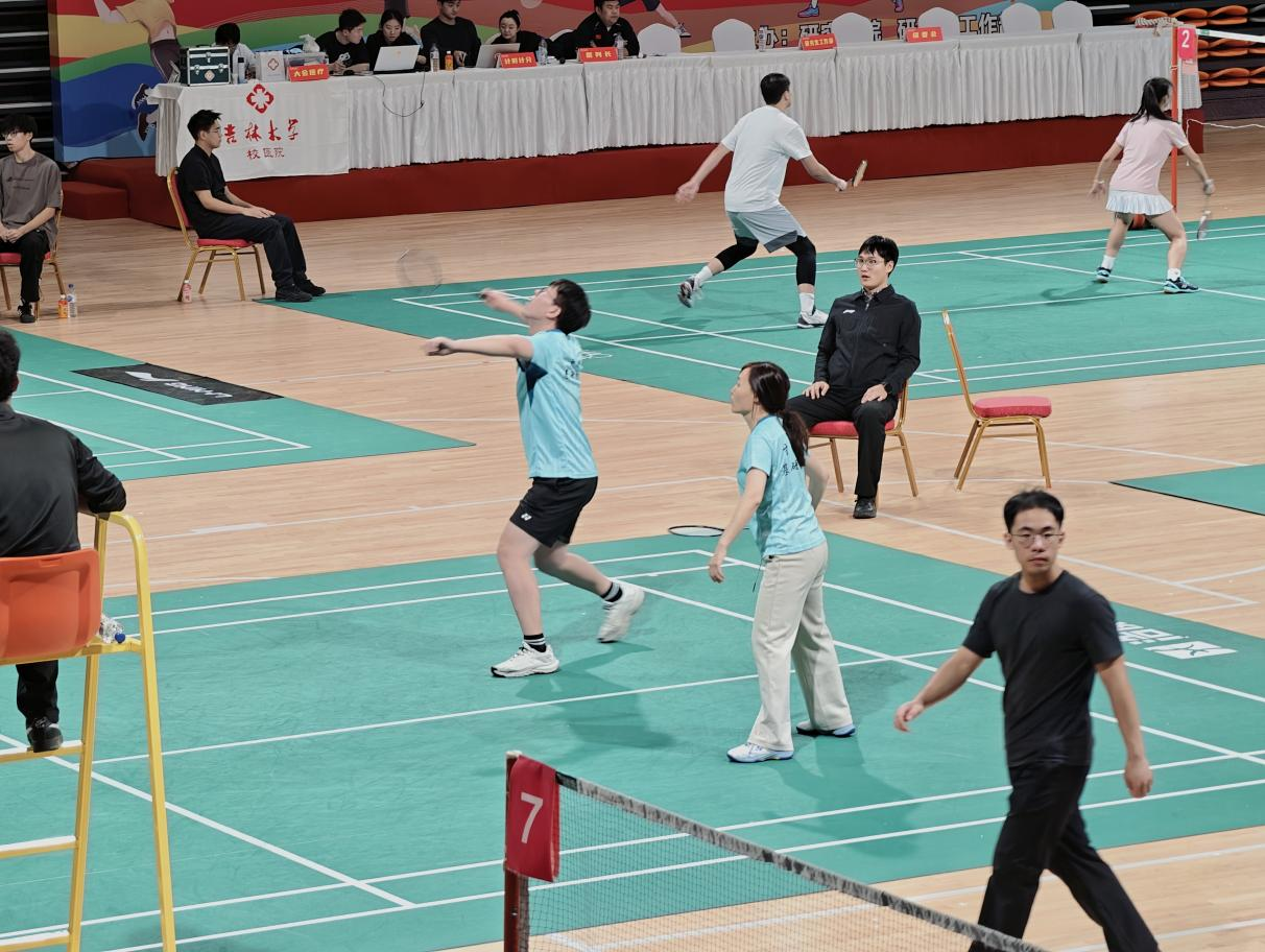 赛场上,基础医学院参赛队伍的表现可谓亮点纷呈,将团队协作与拼搏精神展现得淋漓尽致。在关键的混合双打对决中,教师选手凭借稳定的心态控制节奏,学生选手则以敏捷的反应发起突袭,两人眼神交汇间便能领会战术意图——一次精准的网前截击、一记势大力沉的后场扣杀、一回惊险的极限救球,每一个精彩瞬间都引来场边观众的阵阵喝彩。