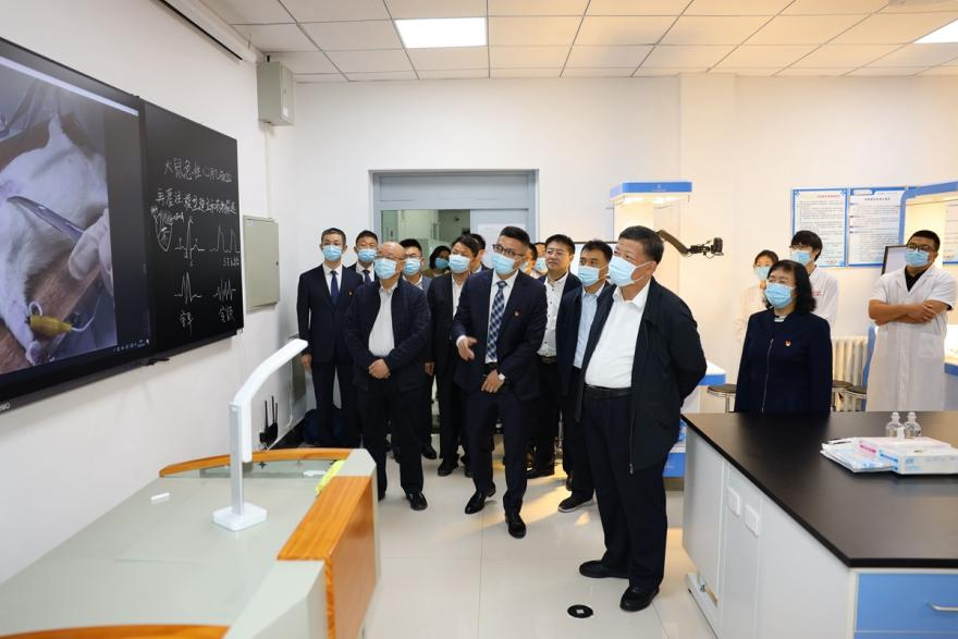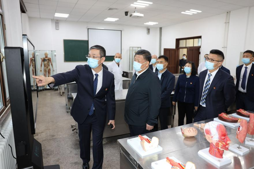 姜治莹走进虚拟仿真实验室、解剖教研室3D虚拟、大体塑化标本和智慧实验室筹建现场,听取关于实验室建设背景、研究方向、科研进展、发展规划等情况介绍,对实验室通过信息化手段,提高实验操作互动性,提升实验室智慧化教学水平给予肯定。姜治莹表示,医学学科是支撑国家经济社会发展的重要学科,是学校“双一流”建设的重要组成部分,希望大家始终心怀“国之大者”,乘势而上,主动作为,提高吉林大学医学学科的影响力,为学院和学校建设作出新的更大贡献。