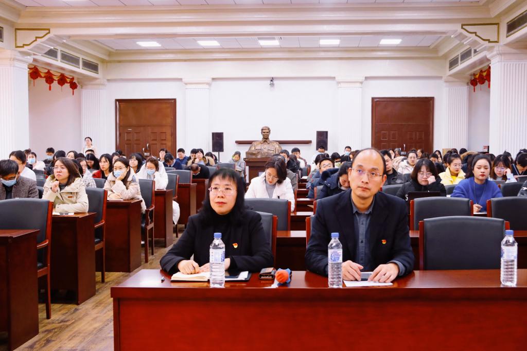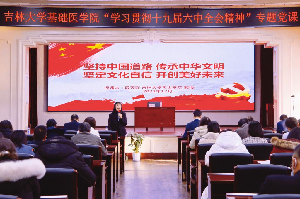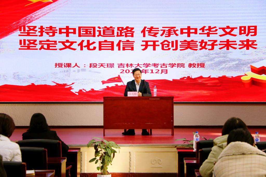 为深入学习贯彻党的十九届六中全会精神,引导广大师生深入学习领会全会精神的丰富内涵与核心要义,2021年12月15日,学院党委邀请吉林大学学习贯彻十九届六中全会精神宣讲团专家、吉林大学考古学院副院长、博士生导师段天璟教授为学院做了一场题为“坚持中国道路,传承中华文明,坚定文化自信,开创美好未来”的专题党课。报告会由学院党委书记王晓荣主持,学院领导班子成员、中层干部及师生党员共计一百余人参加了本次党课学习。