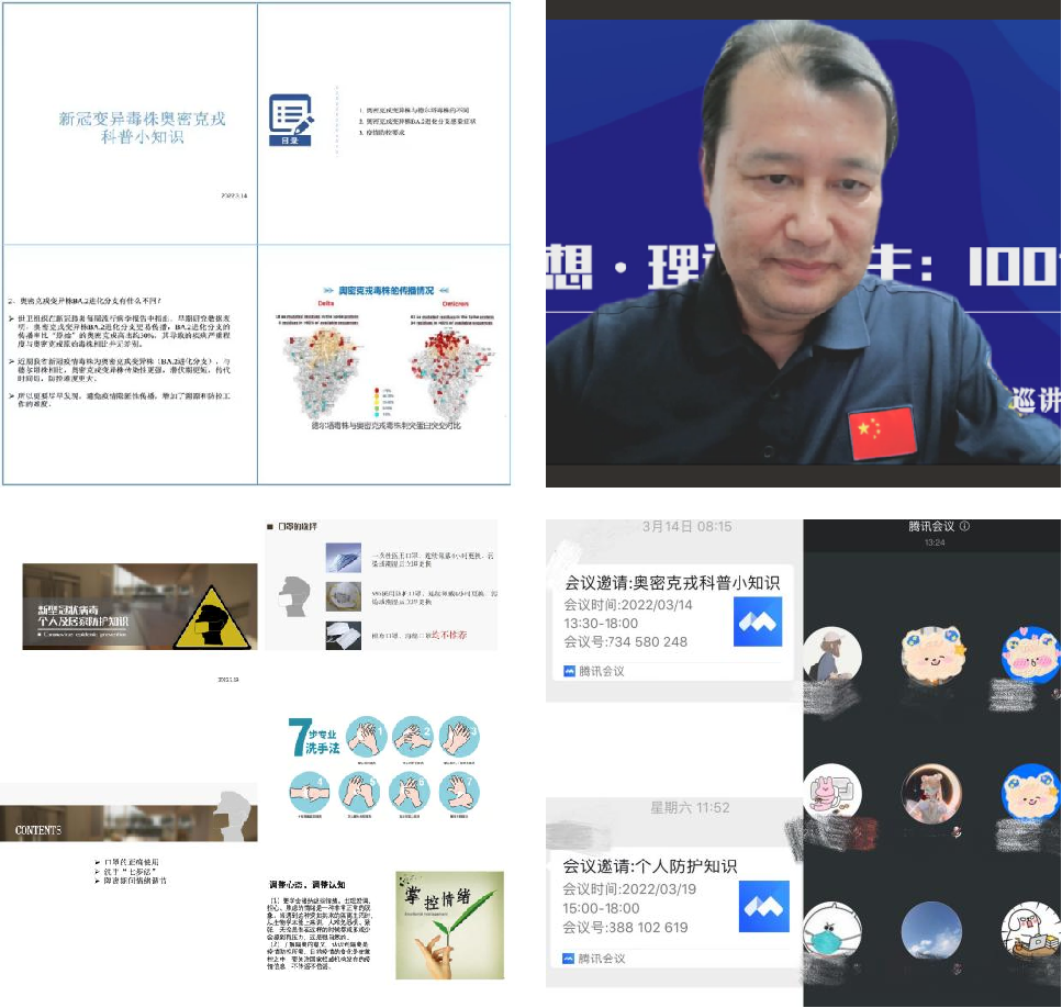 目前,线上课堂已开展三期:(一)“新冠变异毒株奥密克戎科普小知识”,详细介绍本次疫情奥密克戎亚型变异毒株的特点、传播途径、感染症状和抗原检测机制。(二)“新型冠状病毒个人及居家防护知识”,与学生分享隔离期间注意事项、洗手消毒七步法、如何保持良好身心状态等。(三)组织学生观看学生工作部举办的“思想·理论·人生:100讲”——疫情防控名师线上大讲堂系列巡讲第七讲活动。受Galaxy银河王放院长邀请,南方医科大学组织学与胚胎学专业教授、实验管理中心主任董为人教授带来《创新——新时代赋予学子之历史使命》专题讲座。