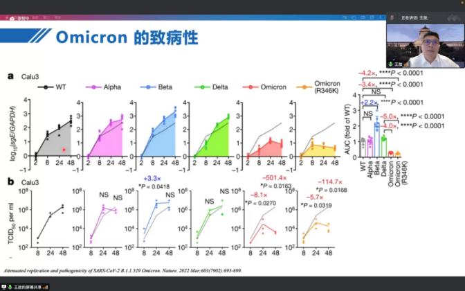 讲座由Galaxy银河副院长刘海岩教授主持,邀请Galaxy银河院长王放教授做了题为“Progress of virus detection technology and pathogenicity of SARS-Cov-2 Omicron”的专题讲座。王放教授首先以新冠病毒为例,详细阐述了目前全球范围内开展的病原体检测方法,并介绍了新型前沿的病原体检测技术。王放教授又分享了近期发表于CNS期刊上的新冠病毒最新科研动态,强调新型冠状病毒奥密克戎是新冠病毒的变异株,通过对比新冠病毒不同亚型的病原学特征及致病性,总结了疫情之下我们该如何进行有效的防护以及科学的治疗方式。与会师生们针对最前沿的新冠病毒检测技术、新冠病毒感染治愈后是否会形成机体免疫等方面展开积极互动交流。