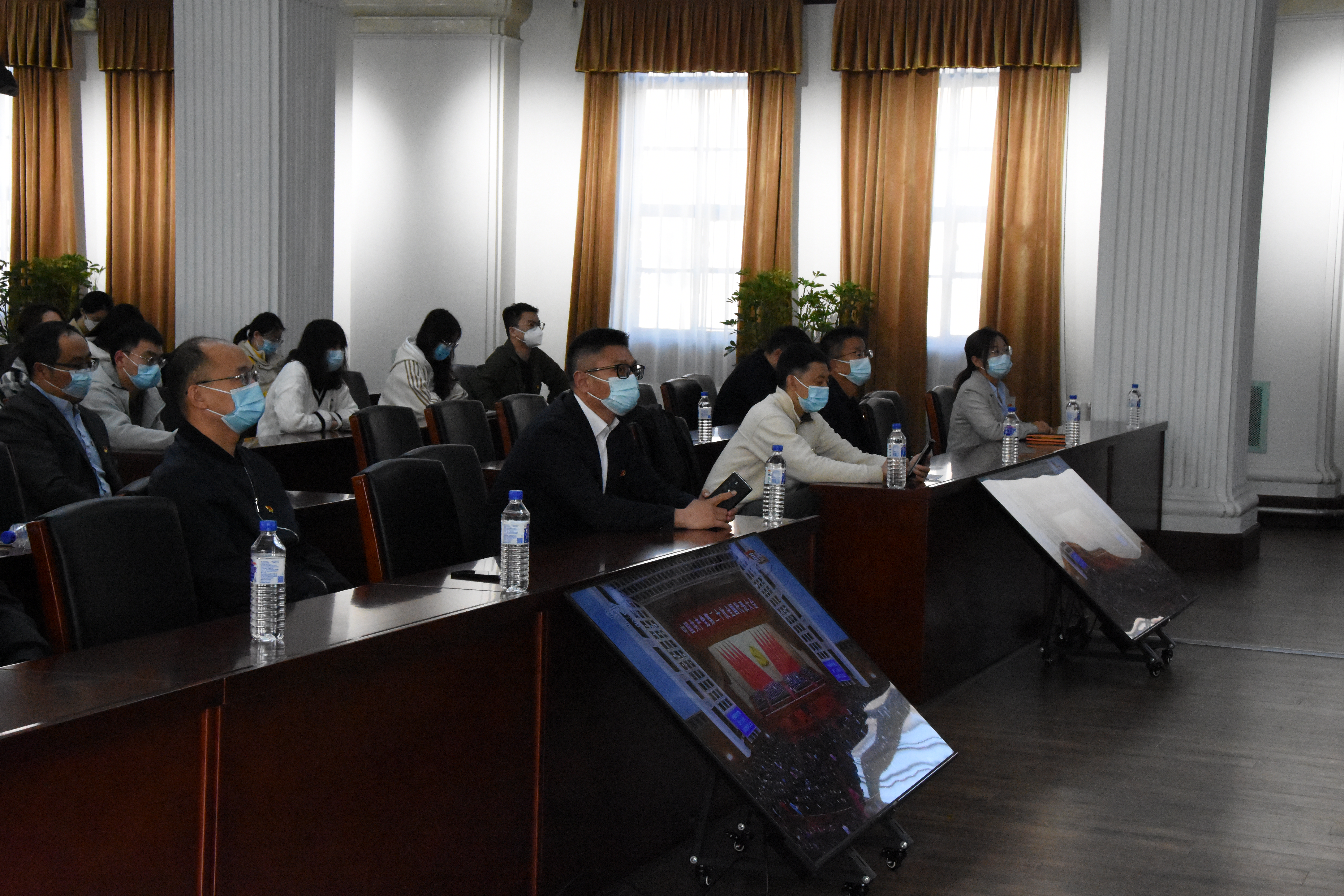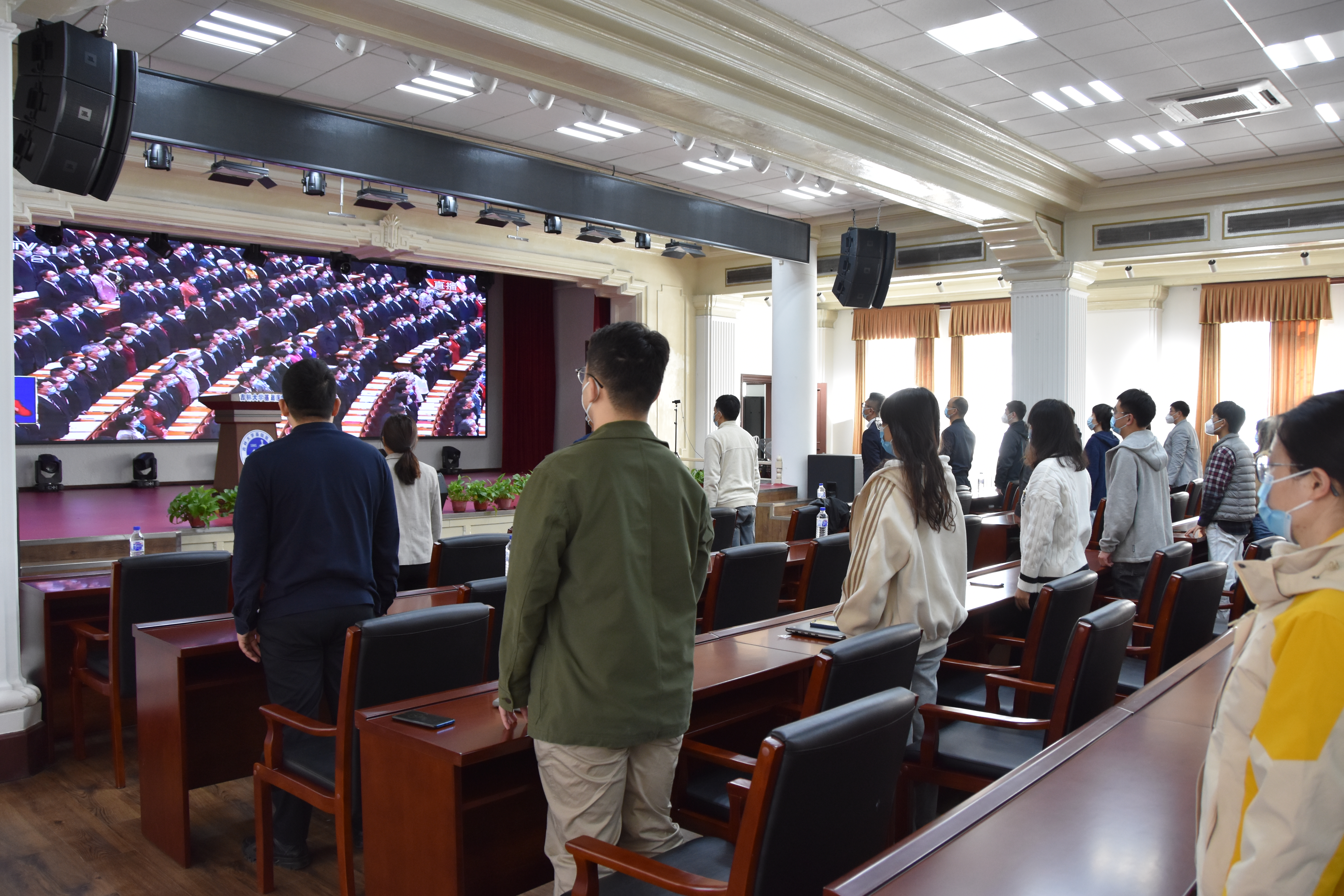 10月16日上午,举世瞩目的中国共产党第二十次全国代表大会在北京隆重开幕。为保证教学、科研工作的顺利开展,基础楼内共有近150名师生驻校进行科研工作和学习,学院院长王放组织驻校工作的师生党员、干部齐聚学院二楼报告厅集中观看中共二十大开幕会的电视直播。10时许,大家集体起立,齐唱国歌,为庄严的开幕式增添浓重热烈氛围。学院党委同时组织各党支部召开线上支部会议,认真收听收看习近平同志代表十九届中央委员会向大会所作的报告,全体党员干部共同见证了这一历史时刻,感受着团结、奋进的时代脉络。