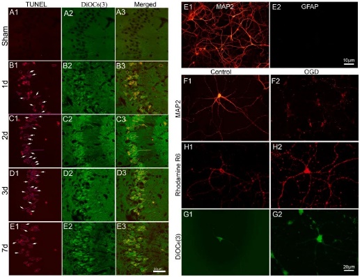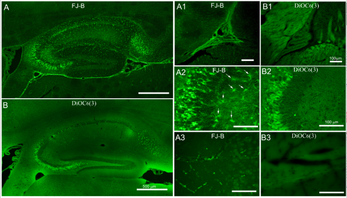 为解决神经科学研究领域这一关键问题,李艳超教授团队研究发现Rhodamine R6/DiOC6两种脂溶性膜结合性染料可以应用于不同实验模型诱导的迟发性神经元死亡的检测,并且与Fluor-jade染色技术具有相同的染色模式和时空分布特征。与传统组织学神经死亡检测技术相比,该项技术染色方法灵活快捷,非特异性反应少,染色结果清晰,还可以根据需要进行双重或多重荧光分析。该染色技术还能够反映神经元质膜系统的改变,因此将检测与神经元死亡机制研究紧密结合在一起。