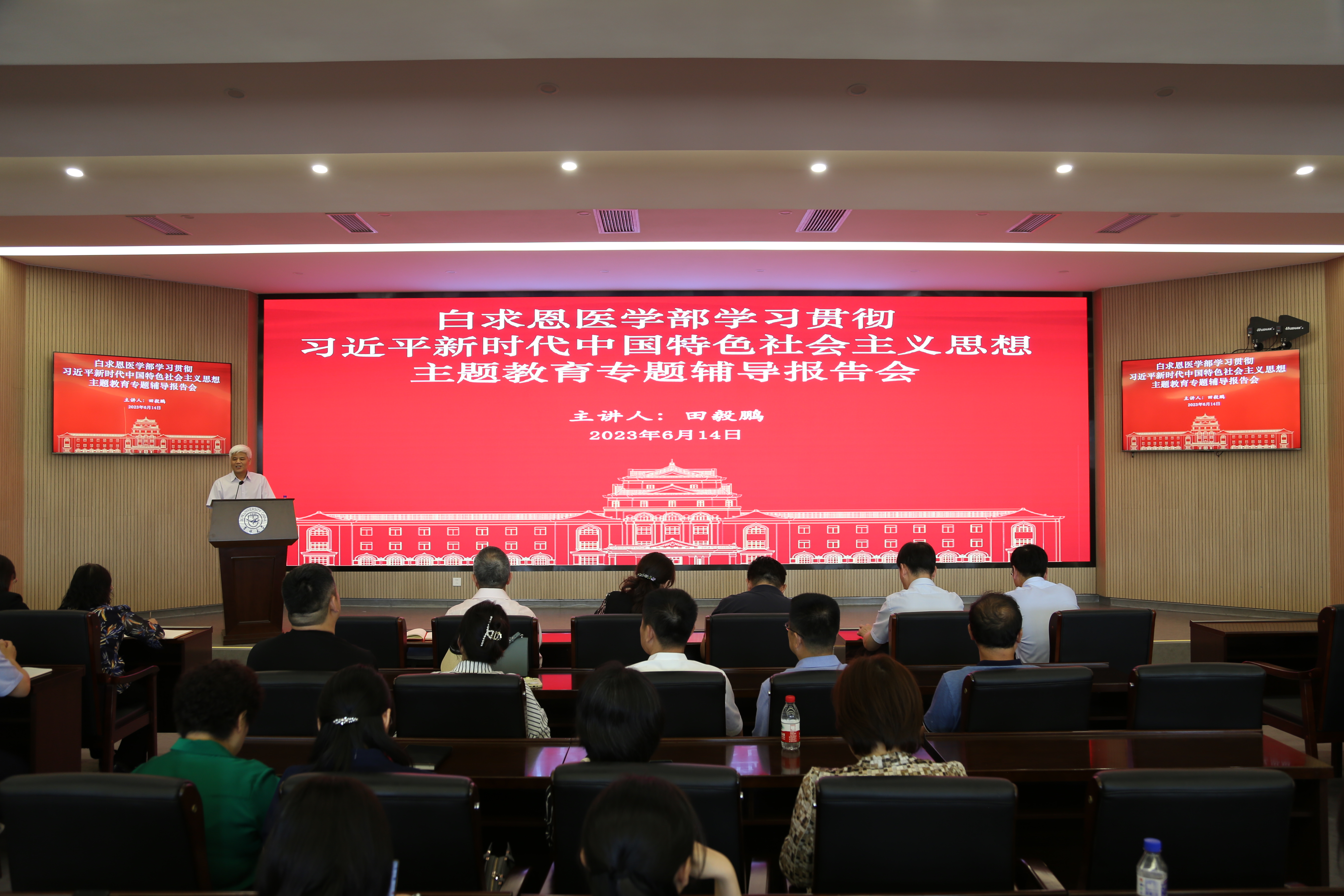 6月14日下午,Galaxy银河党委组织读书班成员、部分教工党员前往第一教学楼白求恩大讲堂,参加由医学部机关、Galaxy银河、公共卫生学院、药学院、护理学院联合举办的学习贯彻习近平新时代中国特色社会主义思想主题教育专题辅导报告会。会议由白求恩医学部党工委常务副书记屈英和主持。
