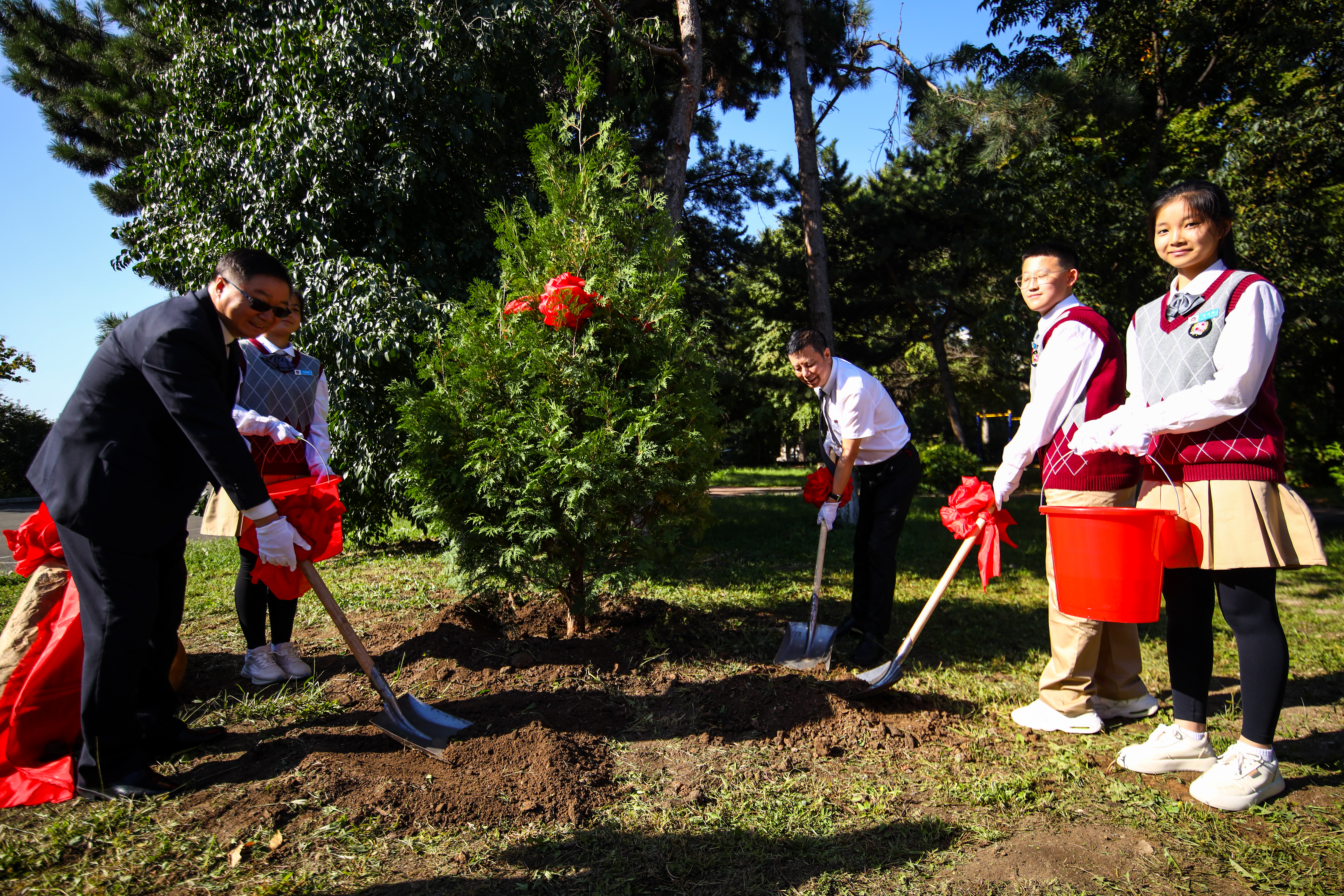 签约仪式开始前,双方隆重举行了植树奠基仪式。挥锹铲土、培土围堰、提水浇灌,种下一颗颗香柏树,培植一片希望之林。赵国庆副校长在仪式致辞中表达了对南湖教育集团王祖良理事长一行的热烈欢迎,他指出吉林大学从基础教育到高等教育涵盖了教育的全过程,本着“厚基础、严要求、重实践”的教育理念,未来吉林大学与南湖教育集团有着广阔的合作空间。希望双方相互学习、相互借鉴、加强合作,共同为祖国培养更多的优秀人才。