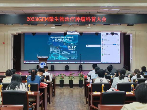 学院党委副书记李东洋,iGEM参赛团队指导教师张灵、杨明,2023级生物医学科学专业班主任辛卓远、闫天昊和全体2022级、2023级本科生共同参加了本次活动。在会上,6支iGEM团队分别汇报交流了自己团队在微生物治疗肿瘤方面开展的研究思路和研究成果。我院JLU-NBBMS团队汇报了不同微生物疗法在肿瘤治疗中的作用和相关研究成果,现场反响热烈,引发同学们争相讨论,为2023级新生同学普及了合成生物学相关知识,也了解到了前沿生物科技的发展与进步。