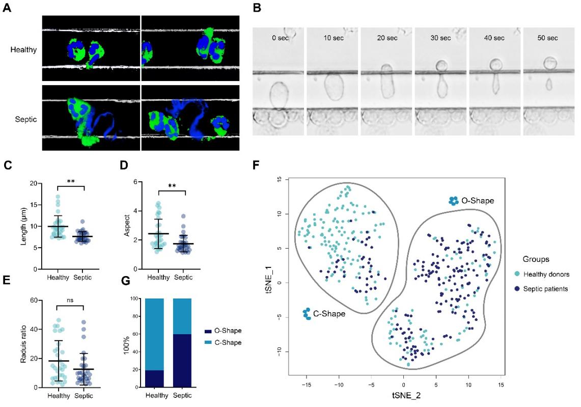 研究利用具有微米级窄缝的微流控装置模拟体内生物障碍,能够实时观察并记录中性粒细胞穿越障碍时的迁移和核形变过程。此外,该研究还开发了一种新的形态分析方法,对大量单个中性粒细胞的核形变进行了定量分析。研究发现,健康人的中性粒细胞能够灵活调整其核形状以穿过狭窄的通道,而脓毒症患者的中性粒细胞核形变能力下降,难以通过5μm以下的狭窄间隙,且在压力下更容易破裂。这项研究为中性粒细胞迁移缺陷提供了新的视角,强调了核形变能力在细胞迁移缺陷中的关键作用,为临床诊断和治疗策略提供了新的视角和方法。