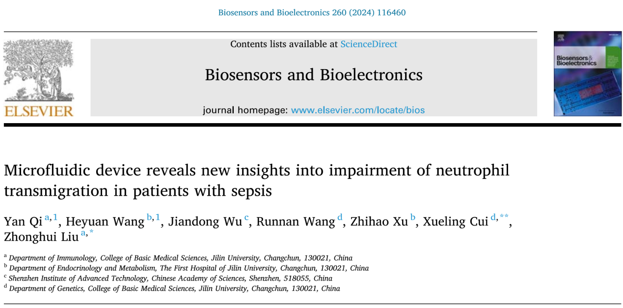 我院免疫学系柳忠辉教授团队于2024年6月1日在国际高影响力刊物《BIOSENSORS & BIOELECTRONICS》上发表了题为“Microfluidic device reveals new insights into impairment of neutrophil transmigration in patients with sepsis”的学术论文。该期刊是生物物理学领域的国际顶尖学术期刊之一,中科院分区为1区,影响因子为10.7。《BIOSENSORS & BIOELECTRONICS》杂志在生物物理学领域和分析化学和电化学领域所有期刊中分别排名第2和第3位,具有很高的学科影响力。齐妍副教授为第一作者、柳忠辉教授及崔雪玲教授共同通讯作者,Galaxy银河作为第一作者单位和唯一通讯作者单位。