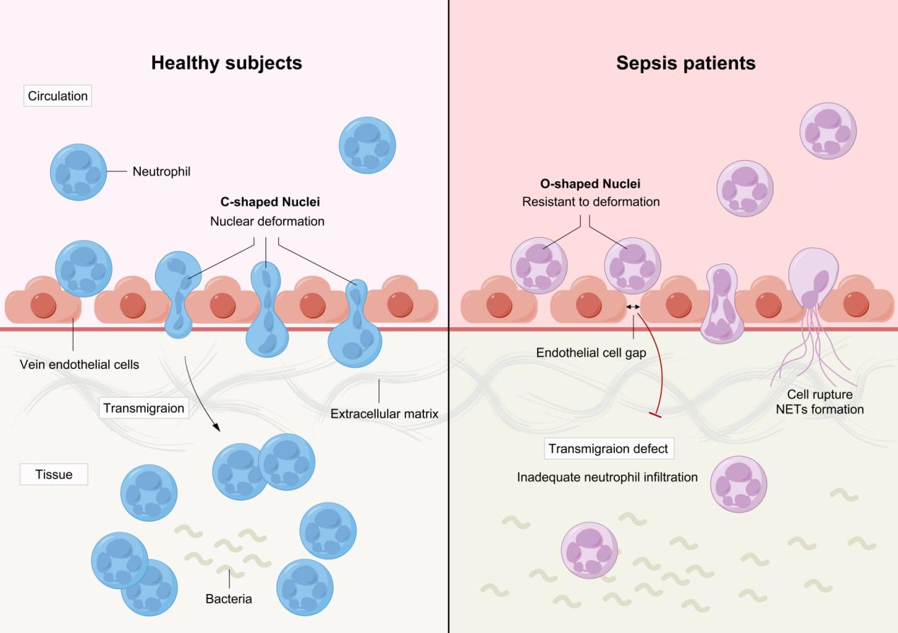 研究表明,在动物模型和脓毒症患者中,中性粒细胞的迁移受损,细胞迁移缺陷与脓毒症死亡风险升高密切相关。因此,大量研究致力于探究中性粒细胞迁移机制。过去的研究主要关注中性粒细胞在平面迁移时涉及的细胞粘附、趋化和极化等过程的分子机制。然而,在实际生物体内环境中,中性粒细胞迁移常受到多种机械障碍的制约。