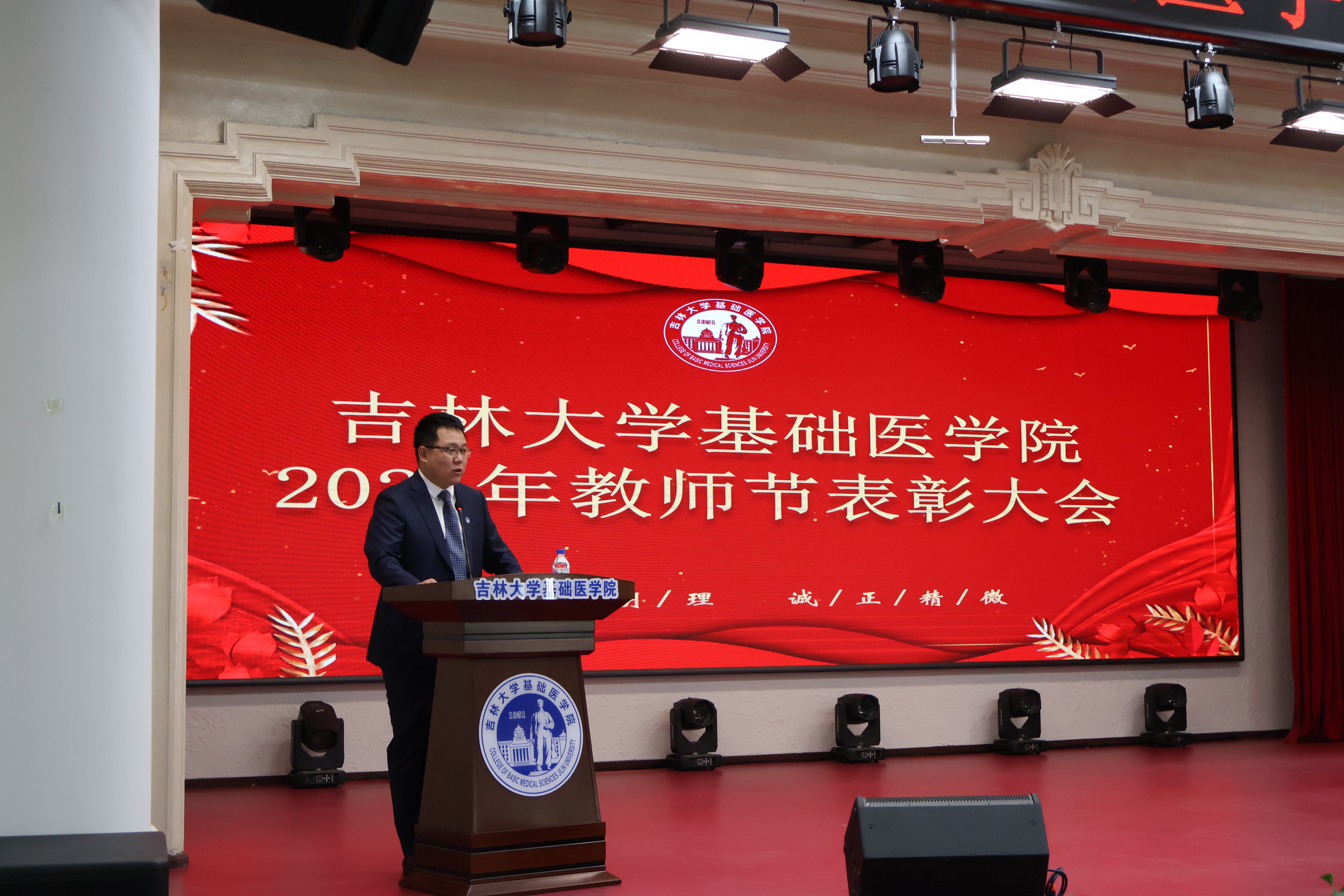 最后,王放院长做总结讲话。他首先代表学院领导班子向学院全体教师表示衷心的感谢和诚挚的问候。王放院长表示,一年来在全院教职工的努力下,学院在思政、教学、学科、科研、实验室管理和开发、师资引进、校园文化建设等多个领域取得了重要进步。他强调,党的二十届三中全会绘就了全面深化改革新蓝图,作为基础教师责任无比重大,使命无比光荣。全院教职工要以习近平在全国教育大会的重要讲话精神为指引,坚定心有大我、至诚报国的理想信念,涵养言为士则、行为世范的道德情操,增进启智润心、因材施教的育人智慧,端正勤学笃行、求是创新的躬耕态度,永葆乐教爱生、甘于奉献的仁爱之心,坚守胸怀天下、以文化人的弘道追求,为培养高素质医学人才而不懈奋斗!表彰大会在吉林大学校歌声中圆满结束。