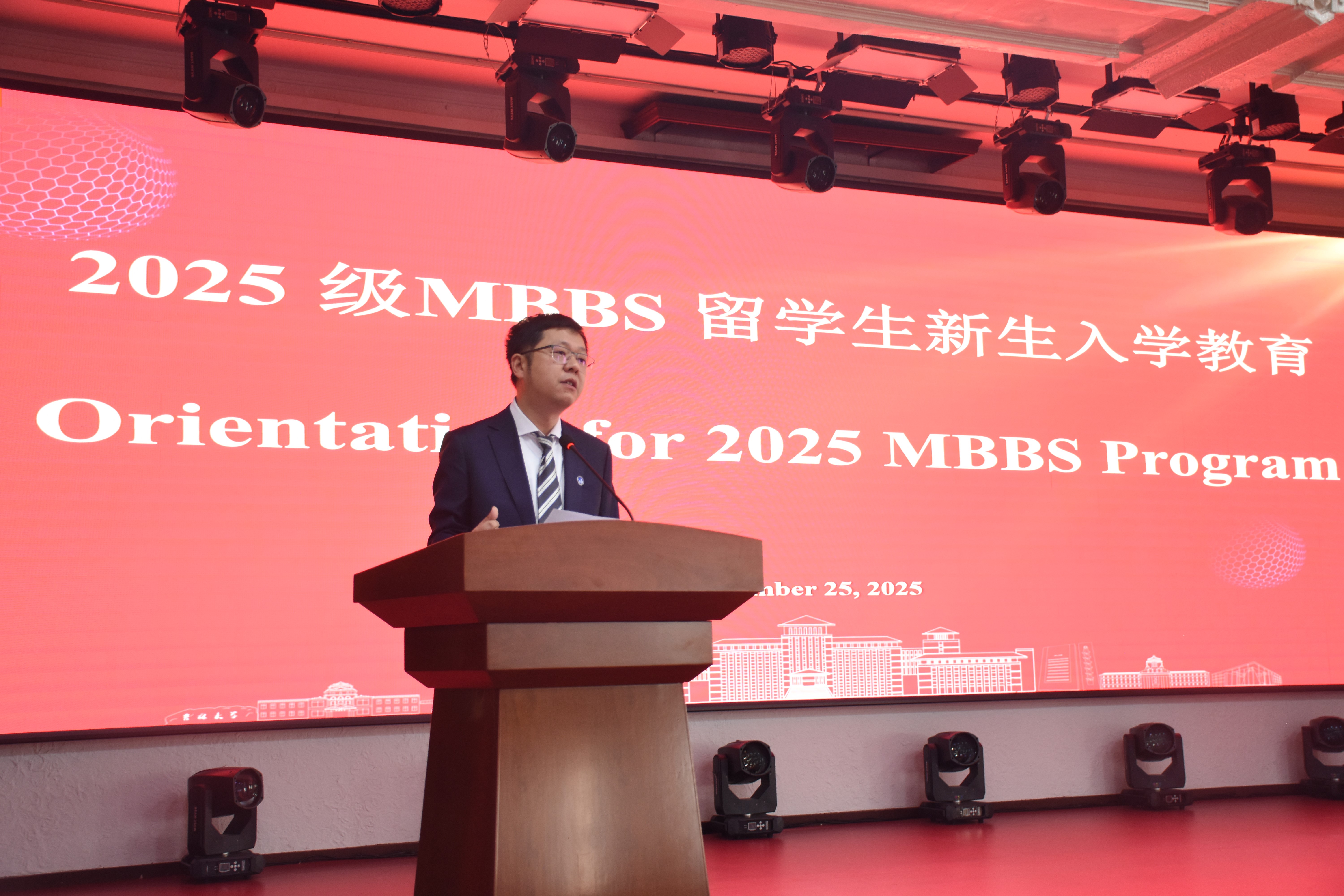 Galaxy银河何侃副院长向2025级MBBS留学生新生表示欢迎和祝贺。他介绍了Galaxy银河的文化底蕴、科研实力以及留学生的人才培养特色,并期望每一位同学在这里成长。同时,他提出了本次新生入学教育的意义,即帮助新生更快地适应在中国的生活和学习,熟悉校园环境,了解各项规章制度。