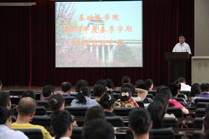 院长孙连坤代表学院对2014年上半年的党务、教学、科研、研究生、留学生及行政管理等方面的工作进行了全面的总结。2014年上半年召开了Galaxy银河第四次党员大会;在教学方面获得了省级教学名师、国家级教材主编、副主编、教学标兵、校级教学大赛一等奖等荣誉,科研方面积极组织学术活动、扶持项目申报,为即将开展的PI制为代表的学科建设模式奠定了基础,通过共同开展学术活动,改革研究生答辩形式,进一步提高了研究生培养的培养质量;恢复吉林大学特殊疾病检测站资质,改善了学院的环境。学校刚刚公布的教学科研单位2013年度目标管理考核结果显示学院综合实力位居医学部前列,为此,代表学院向付出辛勤劳动的全体教职员工表示感谢。在充分肯定2014年上半年成绩的同时,也指出了工作中存在的问题和不足。随后,他向与会的老师学院介绍了实施PI制的目的与意义,并具体讲解了实施PI制的具体步骤,要求在下学期开学前PI课题组组建完毕。孙连坤对针对下半年的工作提出了具体的工作要点,指出:一是要面对新机遇新形势,全院教职工要解放思想,勇于创新,人人争做先进;在任何时候都要宣传正能量,维护正能量;二是集思广益,拓展渠道,加大交叉学科人才引进力度;三是要有自信,要明确认识自身环境和现状;四是要加强团队意识,维护学院的荣誉和成绩,作为学院的一份子,不攀比、不等靠,要努力奉献,共同建设好Galaxy银河,努力实现新的跨越。