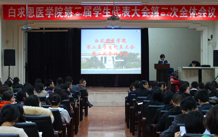 11月4号下午一点,白求恩医学院第二届学生代表大会第二次全体会议在新民校区基础楼二楼多功能学术报告厅召开。白求恩医学院党委副书记兼副院长苑锐、学生工作办公室主任吴剑锋、团委书记夏燕来、辅导员魏宇航及156名学生代表出席了本次会议。会议由院团委第一副书记单锐婷主持。