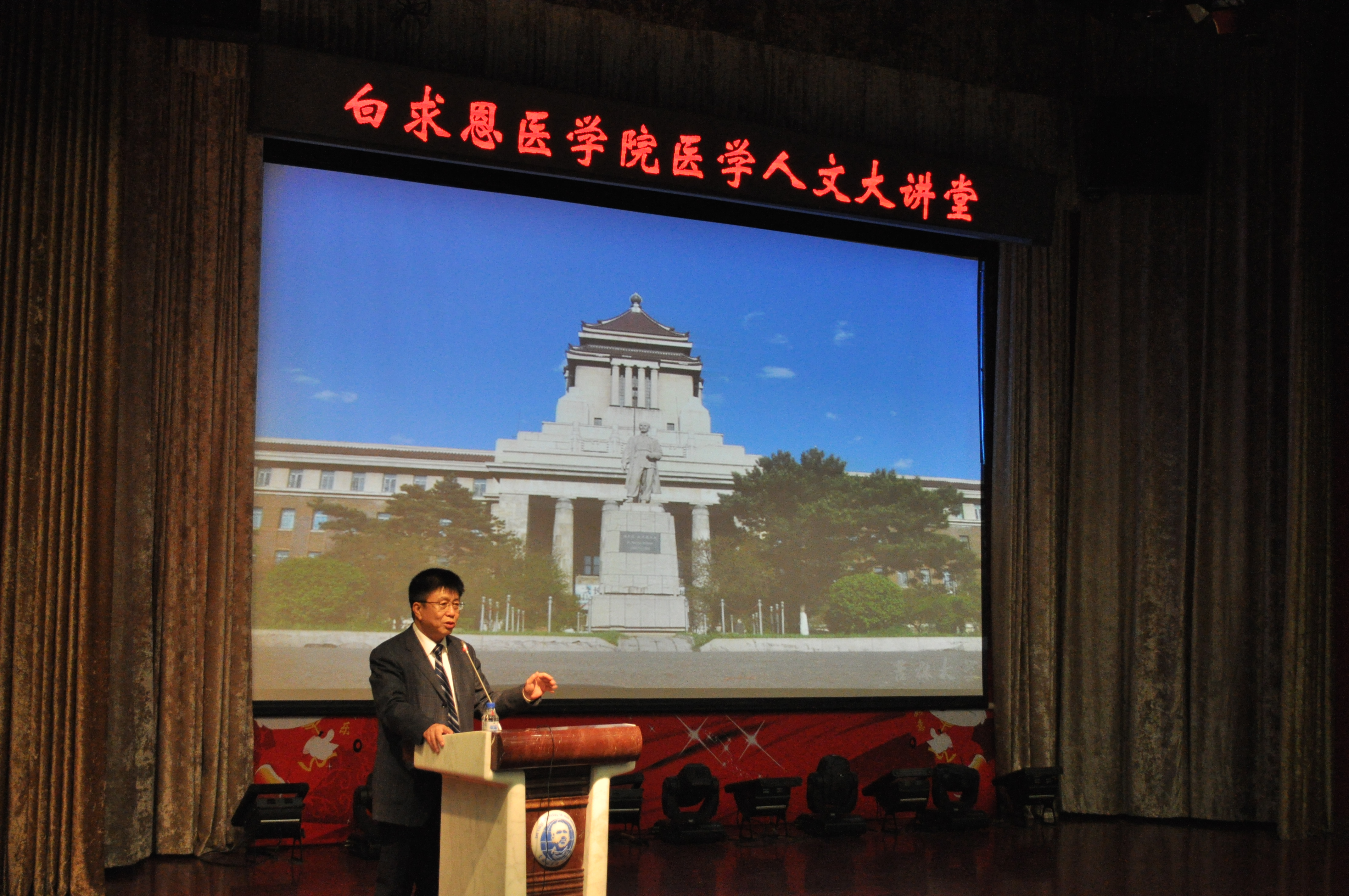 3月31日晚,白求恩医学院在吉林大学白求恩第一医院学术报告厅内举行了“医学人文大讲堂”第14讲——“医学与阳光”,本场讲座的主讲嘉宾是吉林大学副校长、白求恩医学部学部长、白求恩第一医院院长王冠军教授。白求恩医学院党委副书记兼副院长苑锐、学生工作办公室全体辅导员、学院全体学生干部及部分学生代表等600余人聆听了讲座。讲座由团委副书记李梓萌主持。