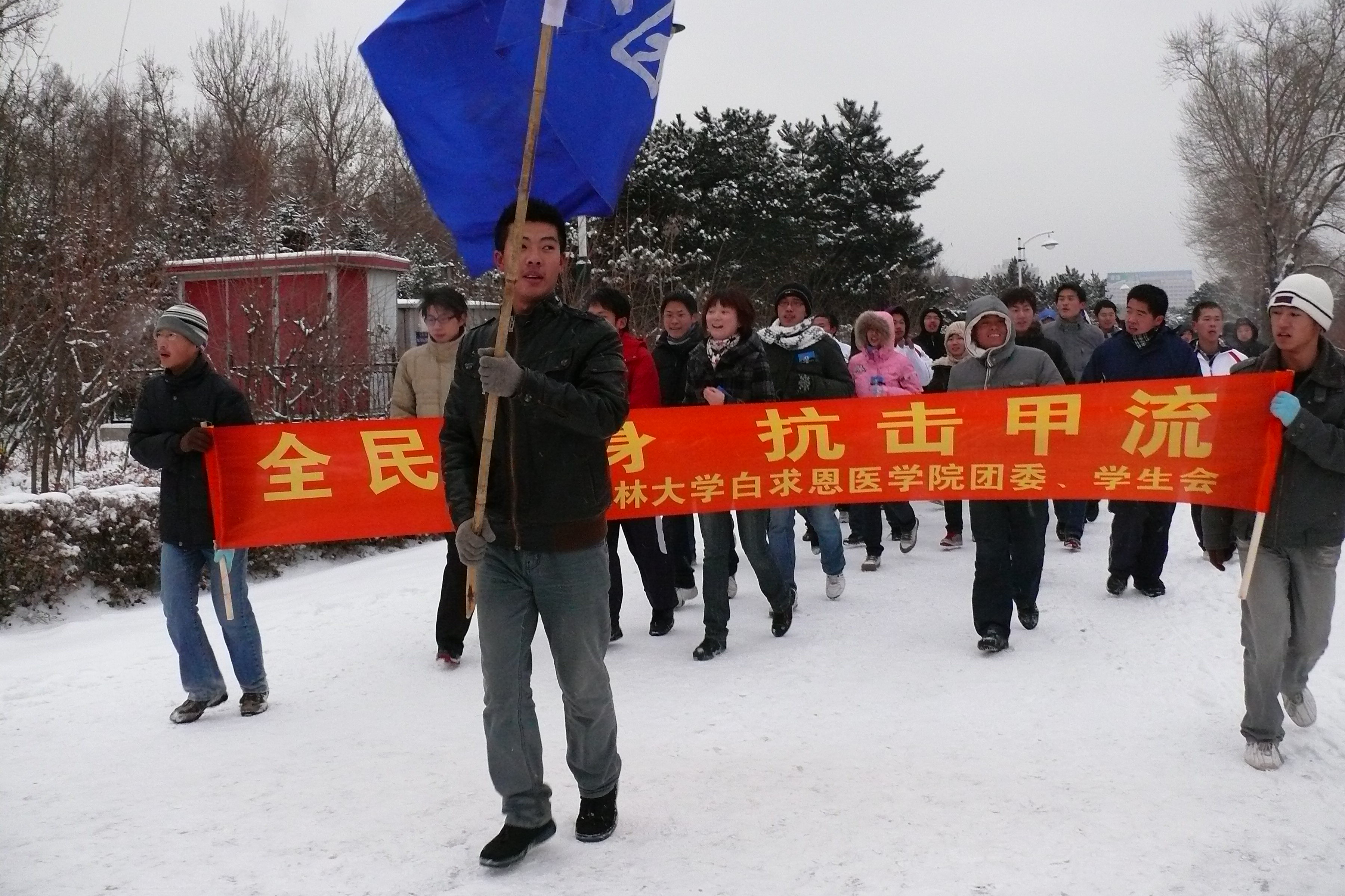 14日清晨7点,“全民健身,抗击甲流”公益长跑活动在南湖公园展开。我院全体学生党员、院团委学生会全体学生干部及08、09级的学生代表有组织的从新民校区步行来到南湖公园,我院学生会主席赵志媛以及团委组织部部长杜心静进行了跑前动员,团委书记田峰老师打响了此次公益长跑活动的发令枪。虽然清晨寒风刺骨,还飘着小雪,但同学们在活动中表现出了高度的热情。大家纷纷表示,作为医学生,白求恩的后继者,我们有责任更有义务在疫情肆虐之时发挥我们的先锋模范带头作用,身体力行,向世人传达甲流可防可治不可怕的思想,引领“全民健身 抗击甲流”的时代潮流。