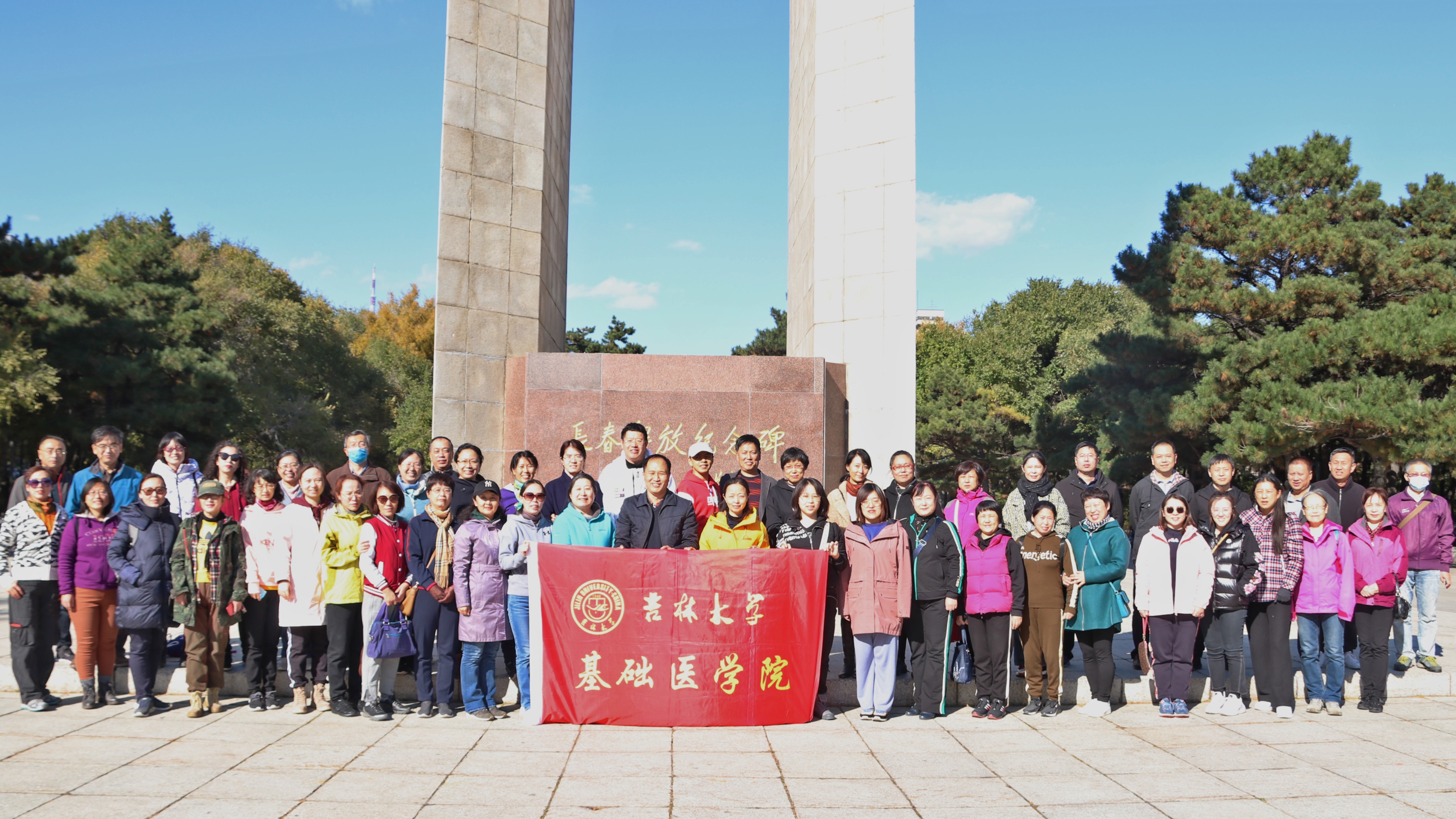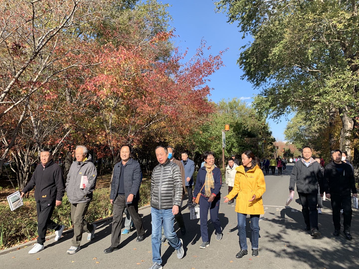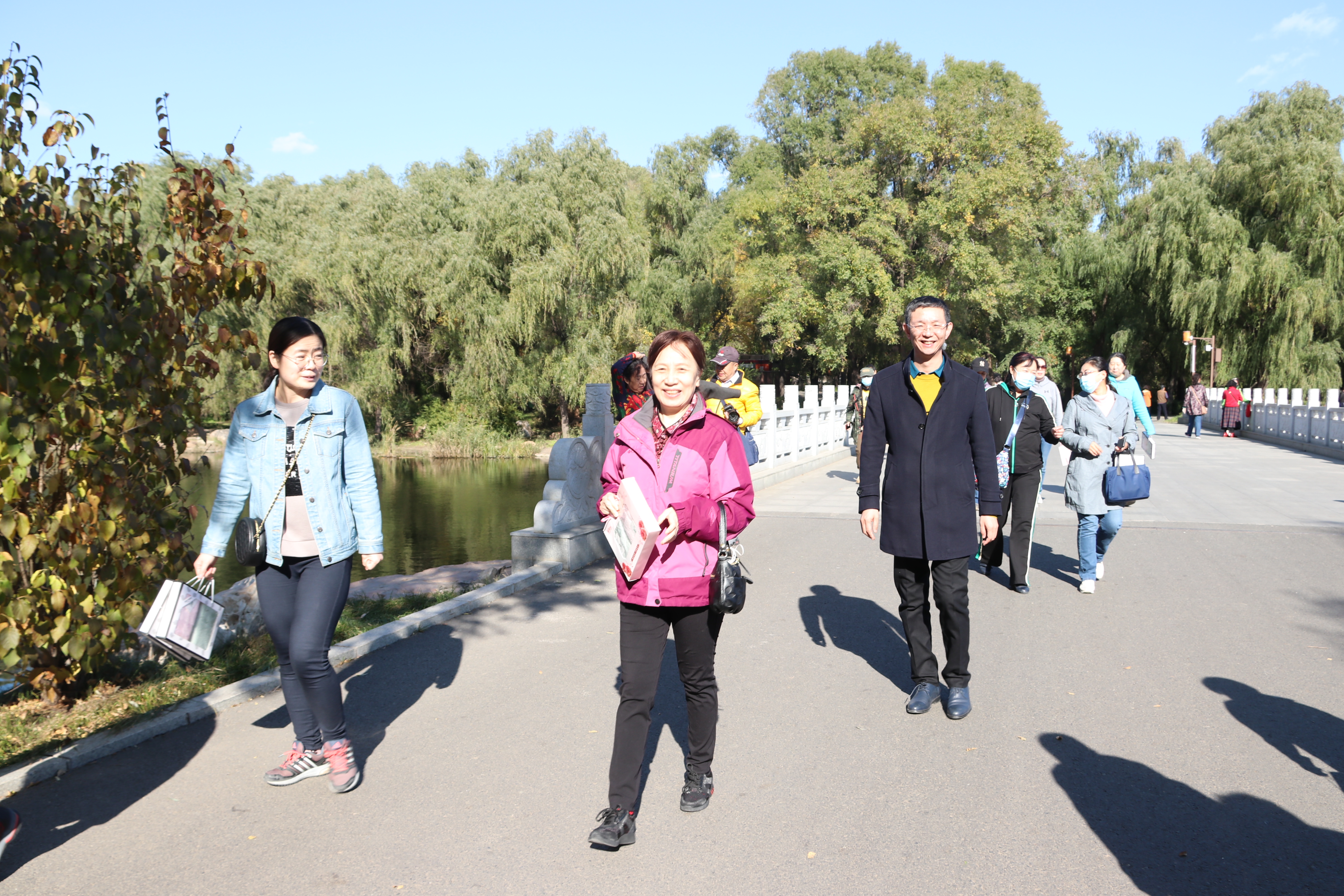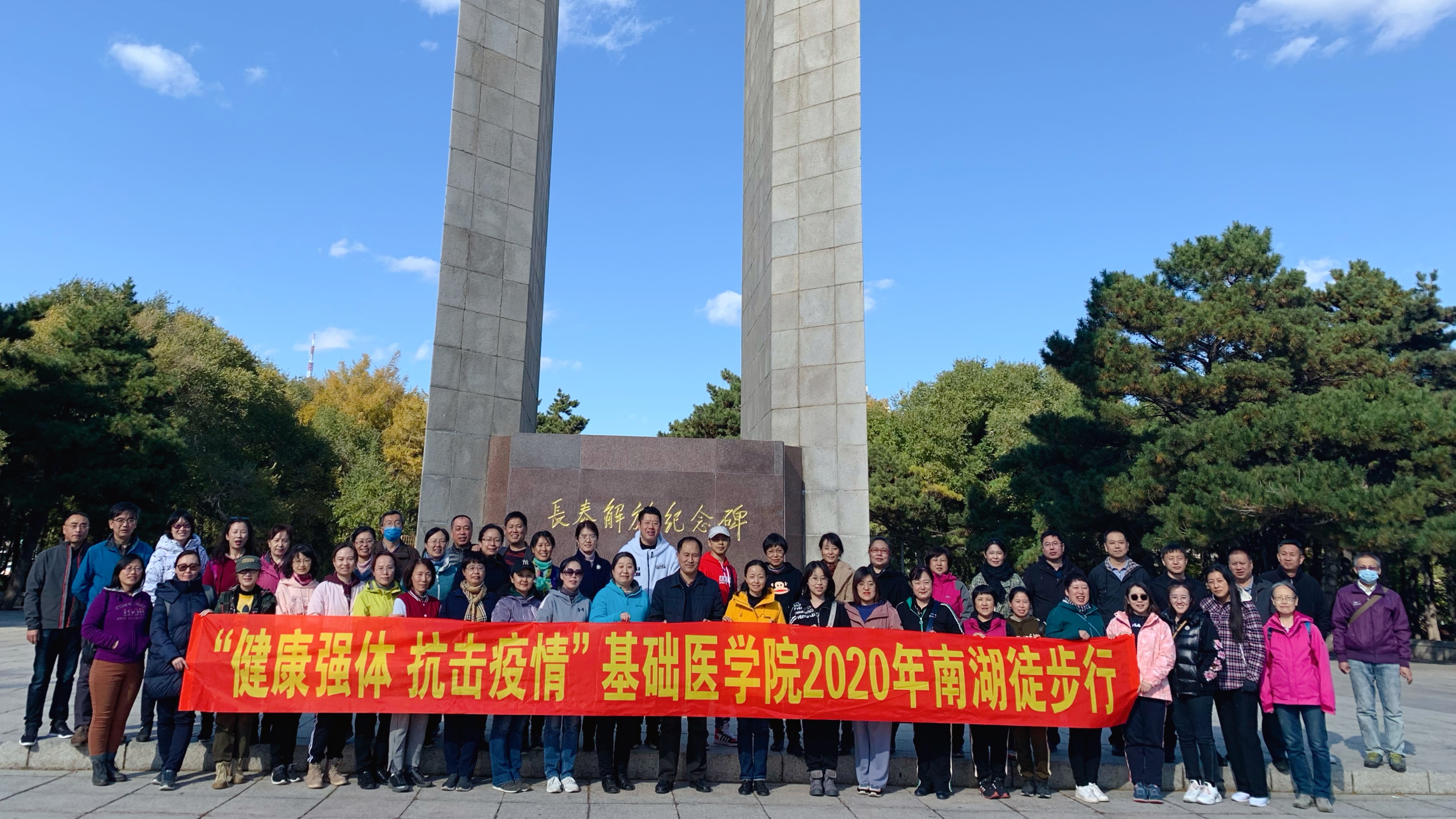 徒步活动从南湖公园长春解放纪念碑处开始,历时1个多小时,活动得到了全院教职工的积极响应和参与。一路上,大家欢声笑语,互相交流,感受季节变化的魅力,释放工作带来的压力。阳光明媚的天空,微波荡漾的湖面,色彩缤纷的枝叶,老师们或步履矫健一路向前,或脚步轻盈走走停停,欣赏记录秋色美景。