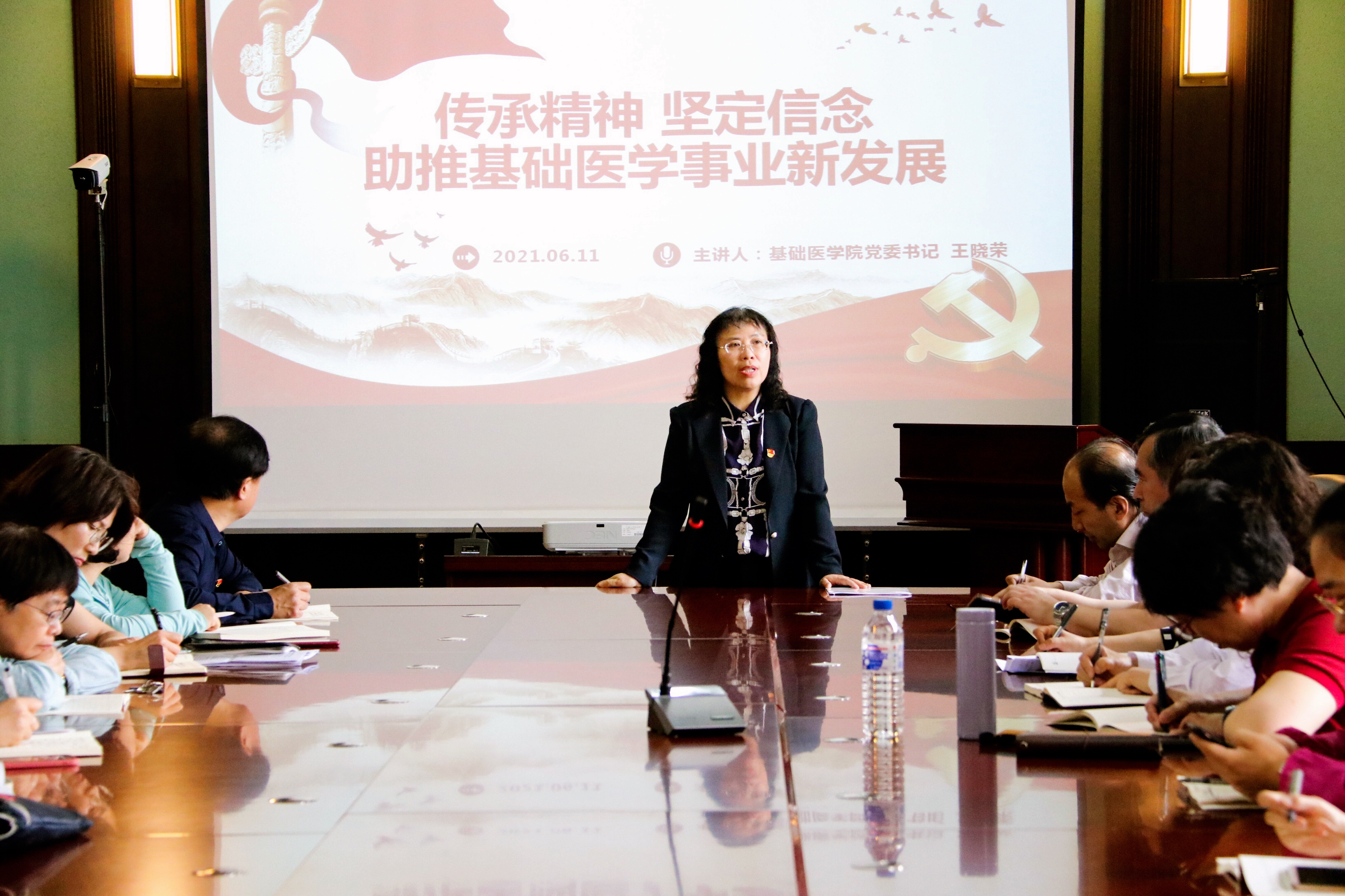王晓荣书记带领大家从“两个务必”讲起,从共产党人的初心、使命和奋斗目标讲起,她与全体党员共同交流:2021年是极其特殊的年份,既是庆祝我们党百年华诞的重大时刻,又是十四五开局之年,是“两个一百年”奋斗目标历史交汇的关键节点,百年未有之大变局给共产党员提出了问题与挑战,她深入浅出的解读了党史学习教育的重要性。最后,王书记结合学院历史和发展的现状以及党史学习教育的核心内涵总结了学院精神。她指出学院精神是由三种精神融合而来,即白求恩精神、革命军队的优良传统以及学院建院精神,最后形成了基础医学人艰苦创业、服务国家、顾全大局的奋斗精神,形成了孜孜不倦、严谨求真、开拓创新的科学精神。2021年是Galaxy银河建院70周年,基础医学学科历经82年的发展历程,她强调基础人要凝聚力量,振奋精神,为医学事业的发展积极进取,努力拼搏。