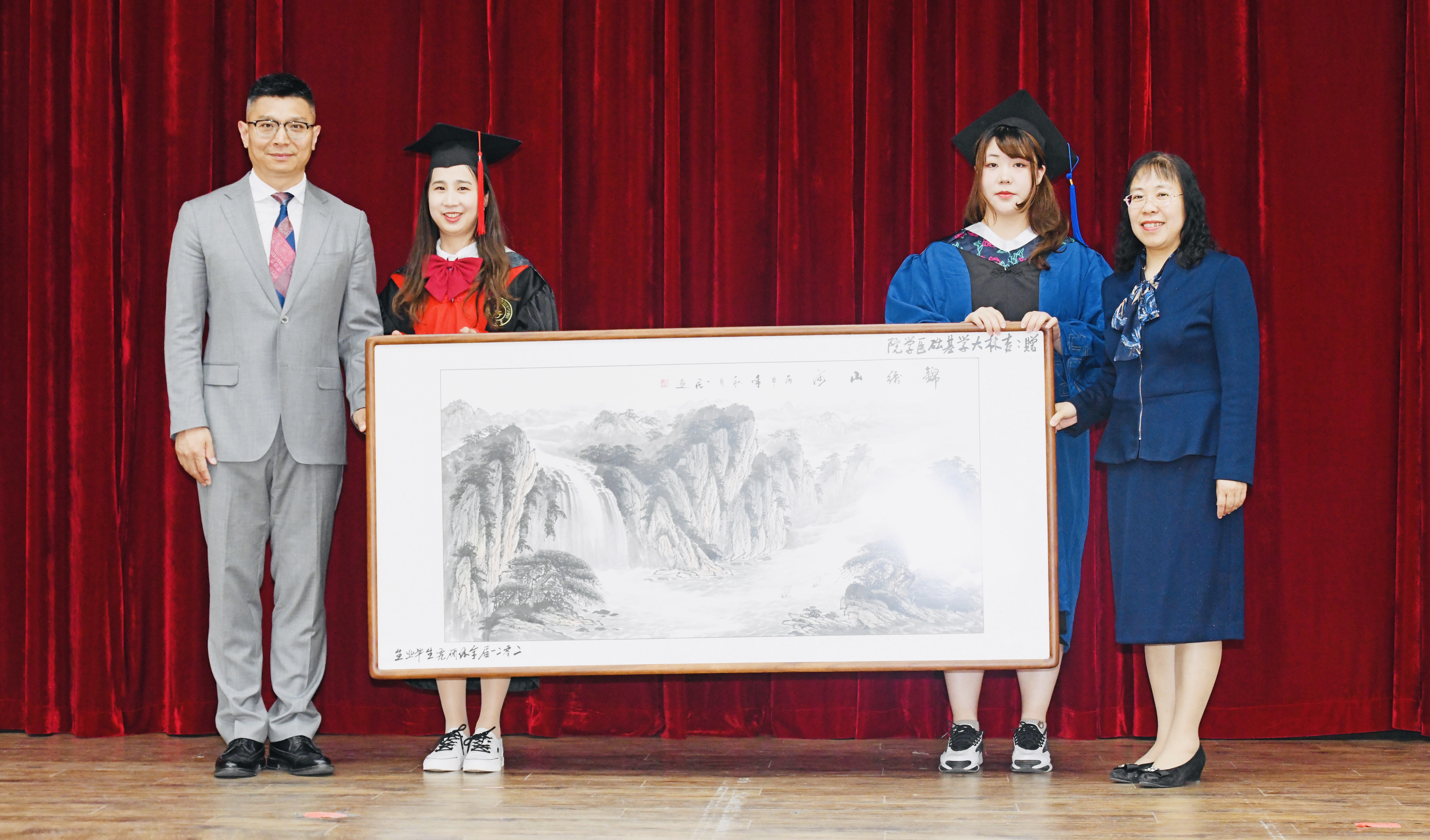 研究生毕业生代表齐明然同学分享了在Galaxy银河难忘的学习经历,如今将再次启程,铭记母校栽培,砥砺前行。全体毕业生向学院敬赠了一份饱含心意的礼物,学院领导与学生代表亲切合影留念。