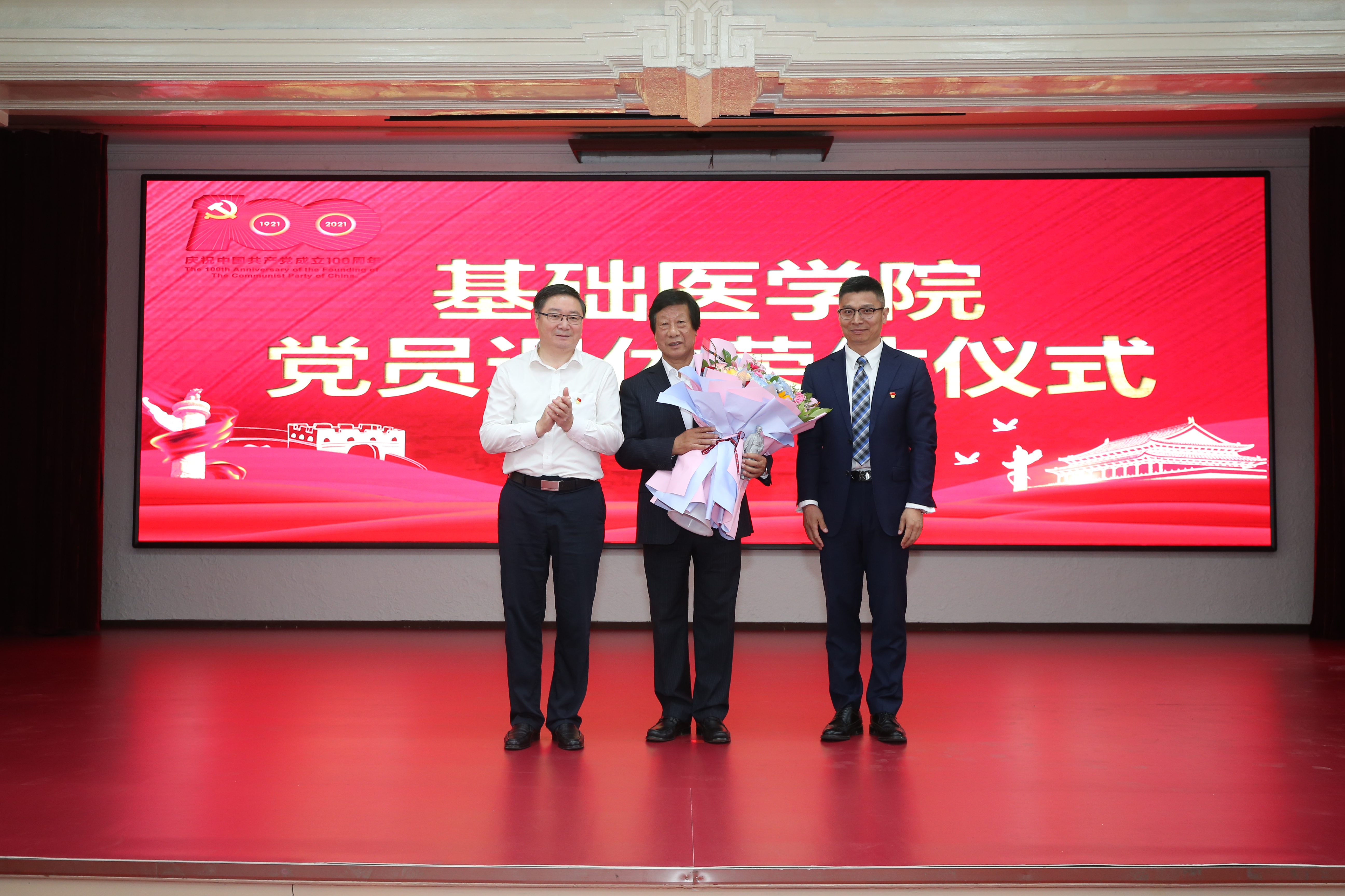 随后进行了Galaxy银河首次党员退休荣休仪式。王晓荣书记介绍了2021年退休的李玉林、李一、王琳三位党员教授的基本情况,李玉林教授参加工作52年、党龄49年,李一教授和王琳教授党龄34年,赵国庆副校长为退休党员代表李玉林教授颁发纪念章和3D打印的同版白求恩小塑像,王放院长代表学院赠送了鲜花。李玉林教授在发言中讲到自己从一名知识青年到教授、博士生导师的奋斗经历,表达了热爱党和国家、热爱学校、热爱学院、热爱病理学科的真挚情感,展现了一名老共产党员的精神风范,得到现场师生的热烈掌声。