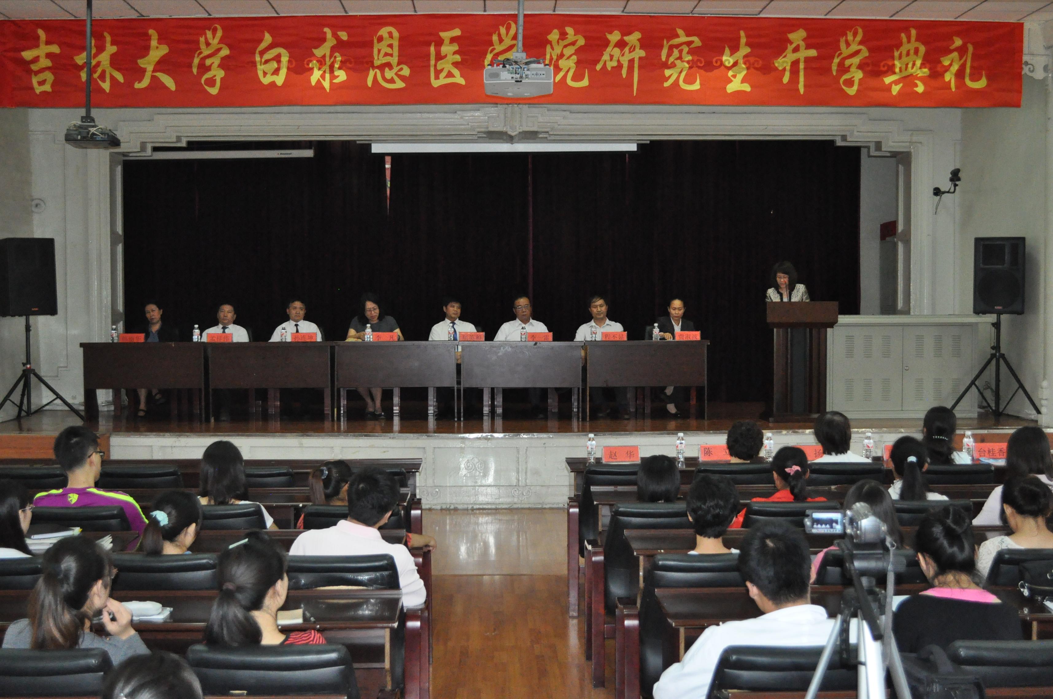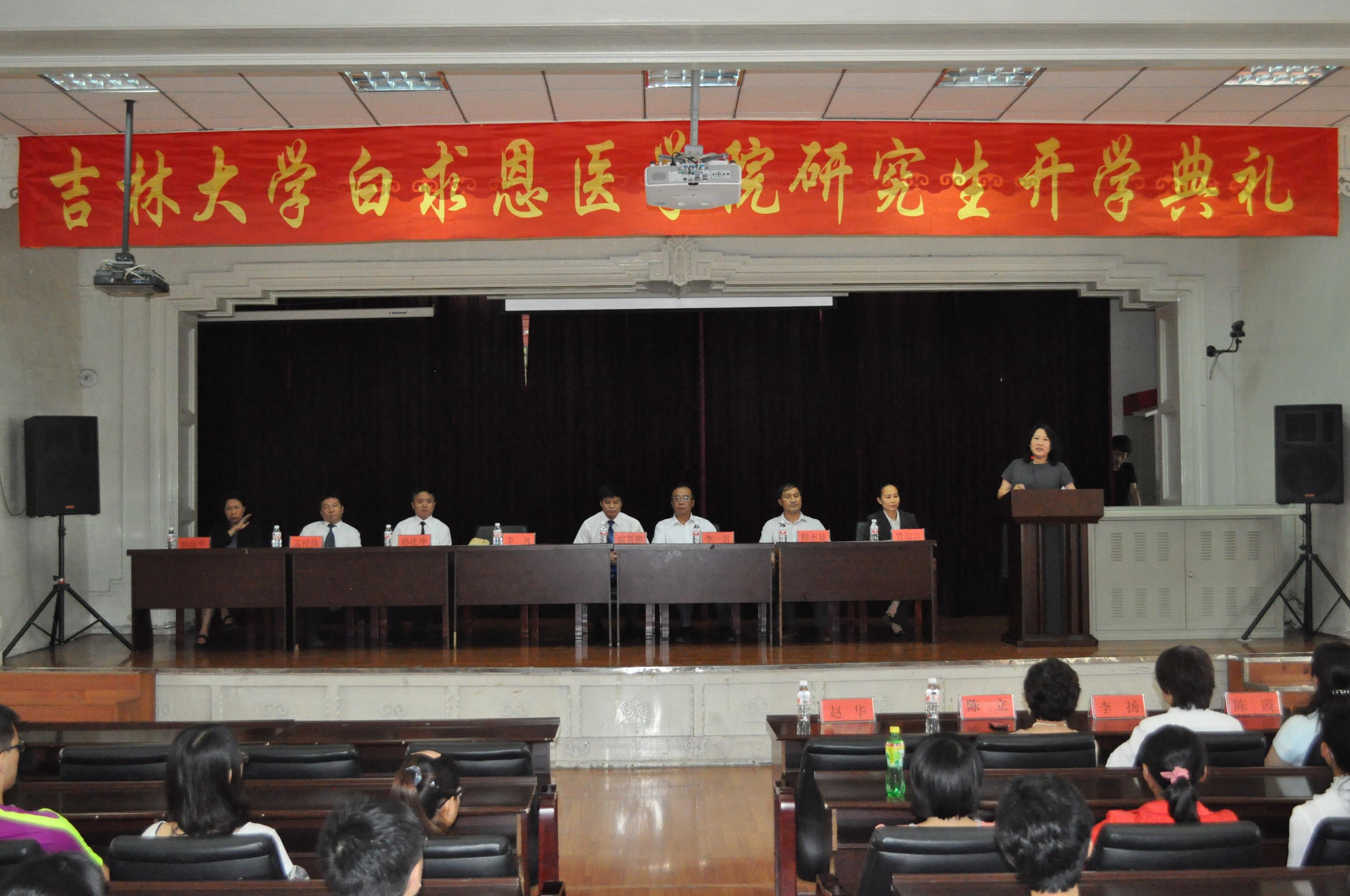 8月29日下午,白求恩医学院2012级研究生开学典礼在基础楼二楼多功能学术报告厅隆重举行。吉林大学校长助理、白求恩医学部常务副学部长、白求恩医学院院长李凡、学院党委书记屈英和、常务副院长孙连坤,副院长李一雷、孟祥伟、程丕显、韩丽华和博士生导师代表李扬、陈立、陈霞、台桂香及2012级研究生一起参加了开学典礼。开学典礼由学院党委副书记费淑波主持。
