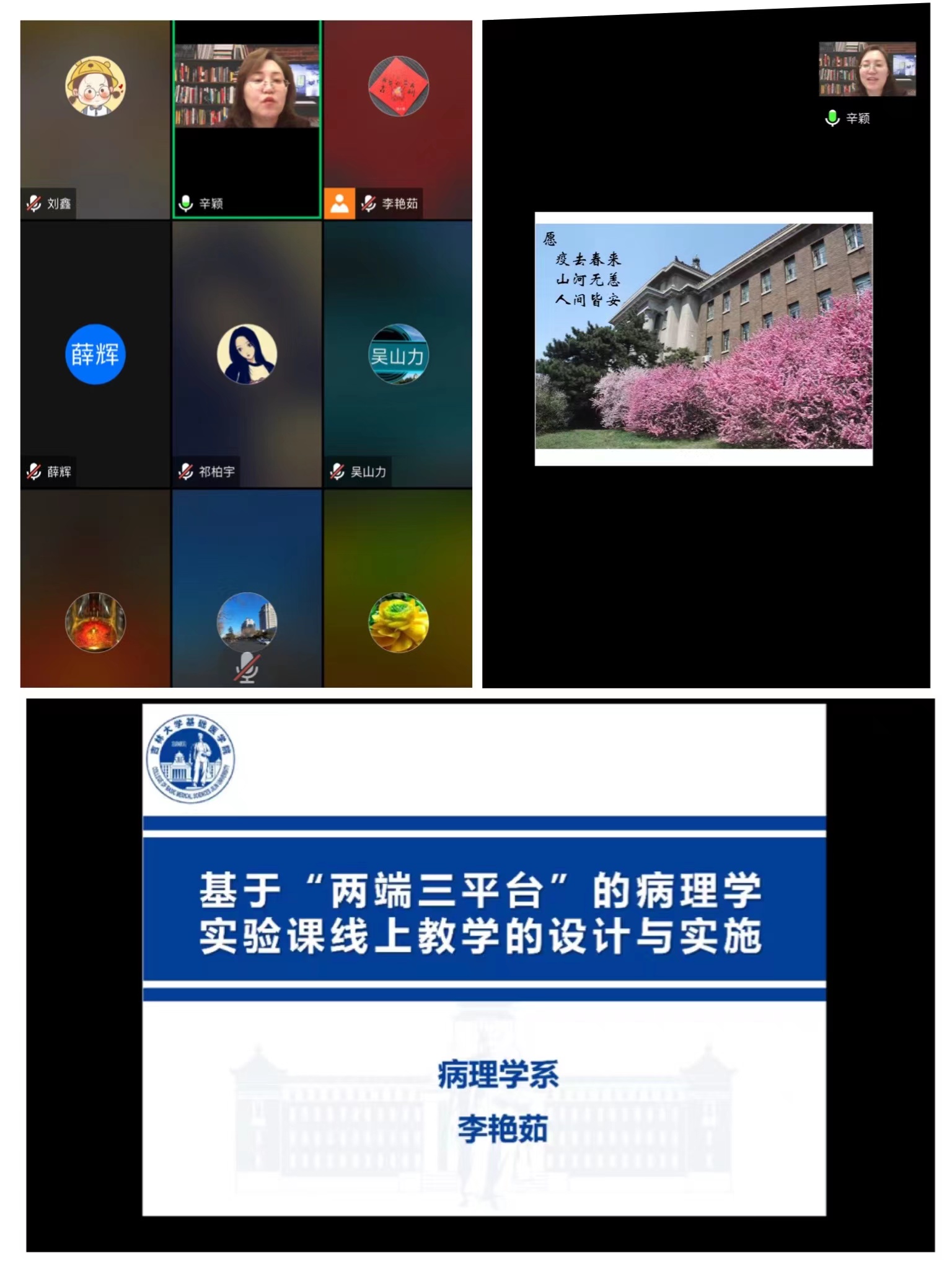 病理学实习课线上教学观摩选择的是石英爱老师讲授的“细胞和组织的适应与损伤”,上课伊始,石老师为各位同学和老师展示了一段吉大优秀学子制作的抗疫合唱视频,鼓励学生要坚信春天一定会很快到来;接着石老师通过病理学系建设完成的形态学数字化教学平台和虚拟实验资源指导学生在云端观察3D大体标本和数字切片,同时通过设计抢答、问答、学生展示等多项互动,调动学生的学习积极性;除此之外,还向参与观摩的老师展示了形态学线上实验的授课安排以及教学设计。在线上教学观摩的基础上,病理学系李艳茹老师又为学院的老师呈现了一场“基于两端三平台的病理学实验课线上教学的设计与实施”的经验分享,李艳茹老师以自己的授课经验为切入点,介绍了学系对于线上实验教学的前期准备工作,并分享了对于“两端三平台”的多维混合模式的线上教学新模式的心得与体会,会后参加培训的老师进行了热烈的讨论。