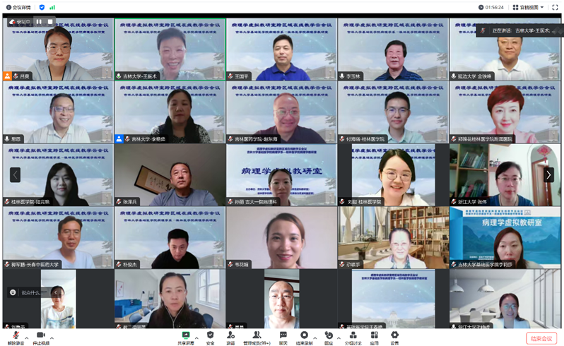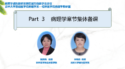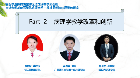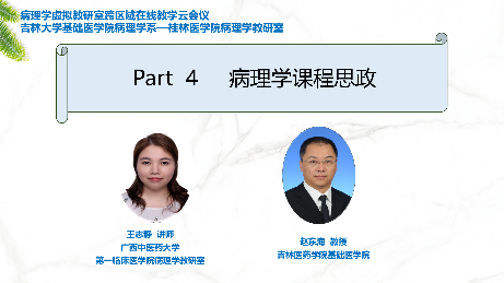 桂林医学院、右江民族医学院、广西医科大学第一附属医院、广西中医药大学、延边大学医学院、北华大学、长春中医药大学、吉林医药学院以及吉林大学的病理学教研室共十四位教师对各自教研室在病理学教学内容及课程设置、教学改革和创新、集体备课、课程思政及教学经验分享等五大方面进行了全面、细致的介绍。