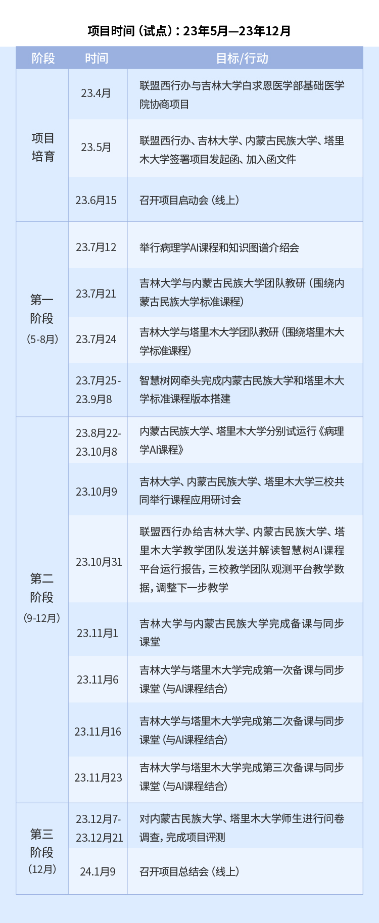 吉林大学、塔里木大学、内蒙古民族大学、联盟西行办公室共同启动的《病理学AI课程》新形态教研西行(试点)项目是一次非常有意义的探索和创新实践。三校共有22位老师、12个班级、466名同学参与项目。该项目通过精准、小范围的跨校教学团队之间的共研、共建、共享、共创,建立了基于知识图谱AI课程的教、研、学共同体,较好地实现了西部行从以“输血”为主到以提升西部高校教师教学能力并使其投入实践教学的“造血”为主的阶段的转变。在数字化素养、课程建设及教研教学上给予了老师们新思路、新方法。期待在各单位项目组老师的共同努力下,提升病理学课程教研和教学的整体水平,将好的经验向其他课程推广,同时把虚拟教研做实做深。