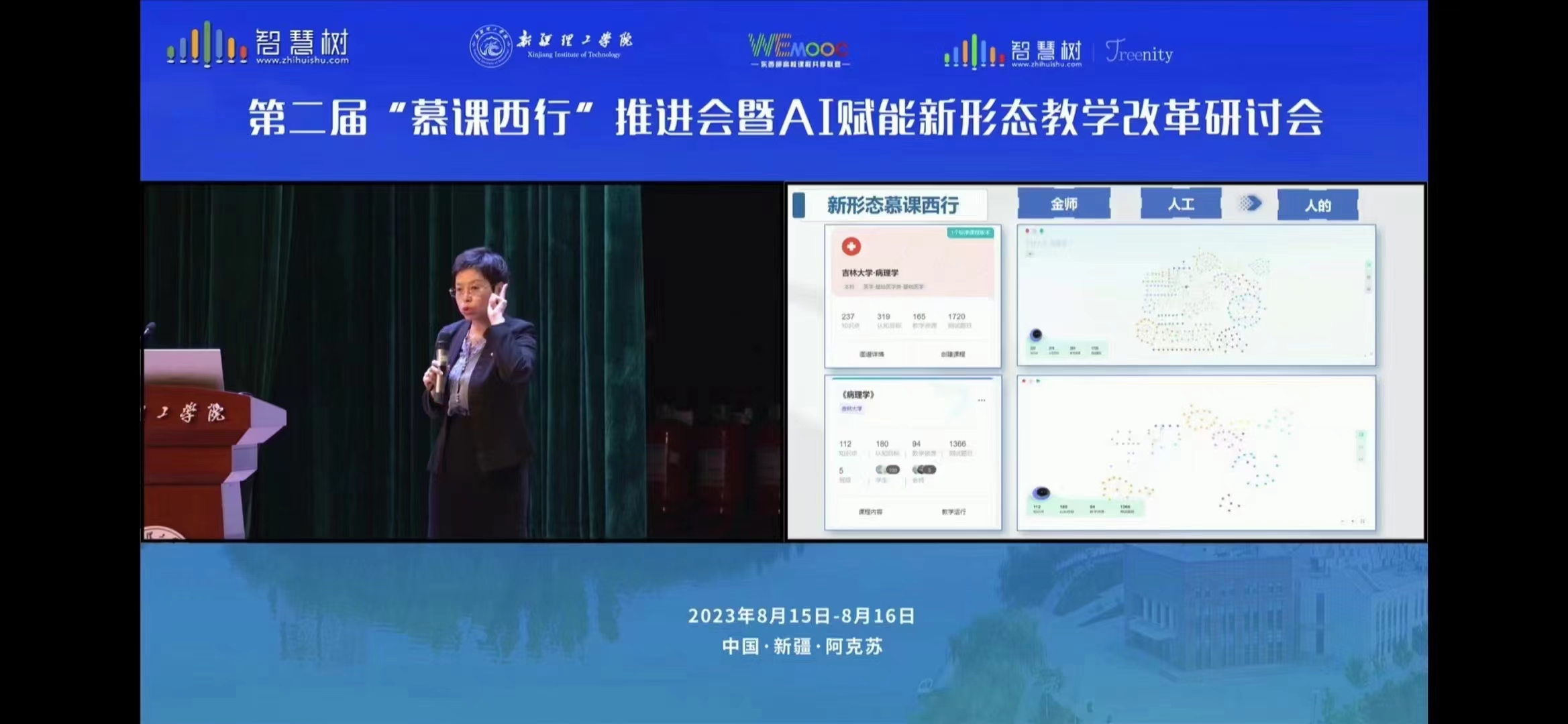 王医术常说:“课程一直都是非常重要的,高校教改,改到深处就是课程。”多年来她一直致力于病理学课程信息化资源建设。“2022年4月13日对我来讲是个特殊的日子,那一天我们做了一场AI课程诞生的教师培训,听完这场培训,我非常兴奋,这就是我想要的课!” 每当讲到这里时,王医术都特别激动。自那天之后,她便带领教学团队着手开始筹建她心中理想的病理学课程,探索从传统课程推进到数字化、智能化、个性化的课程建设。她说:“我一定要做第一个吃螃蟹的人,一定要做出属于我们自己的AI课程。” 在不断地探索、实践、反思等过程后,终于在2022年11月,领衔推出国内第一门病理学AI课程,属于吉林大学白求恩医学部自己的第一门新形态AI课程在智慧树平台成功上线运行,吉林大学的学生从此进入基于知识图谱学习的新时代,她也因此荣获全国教育变革先行者荣誉称号。