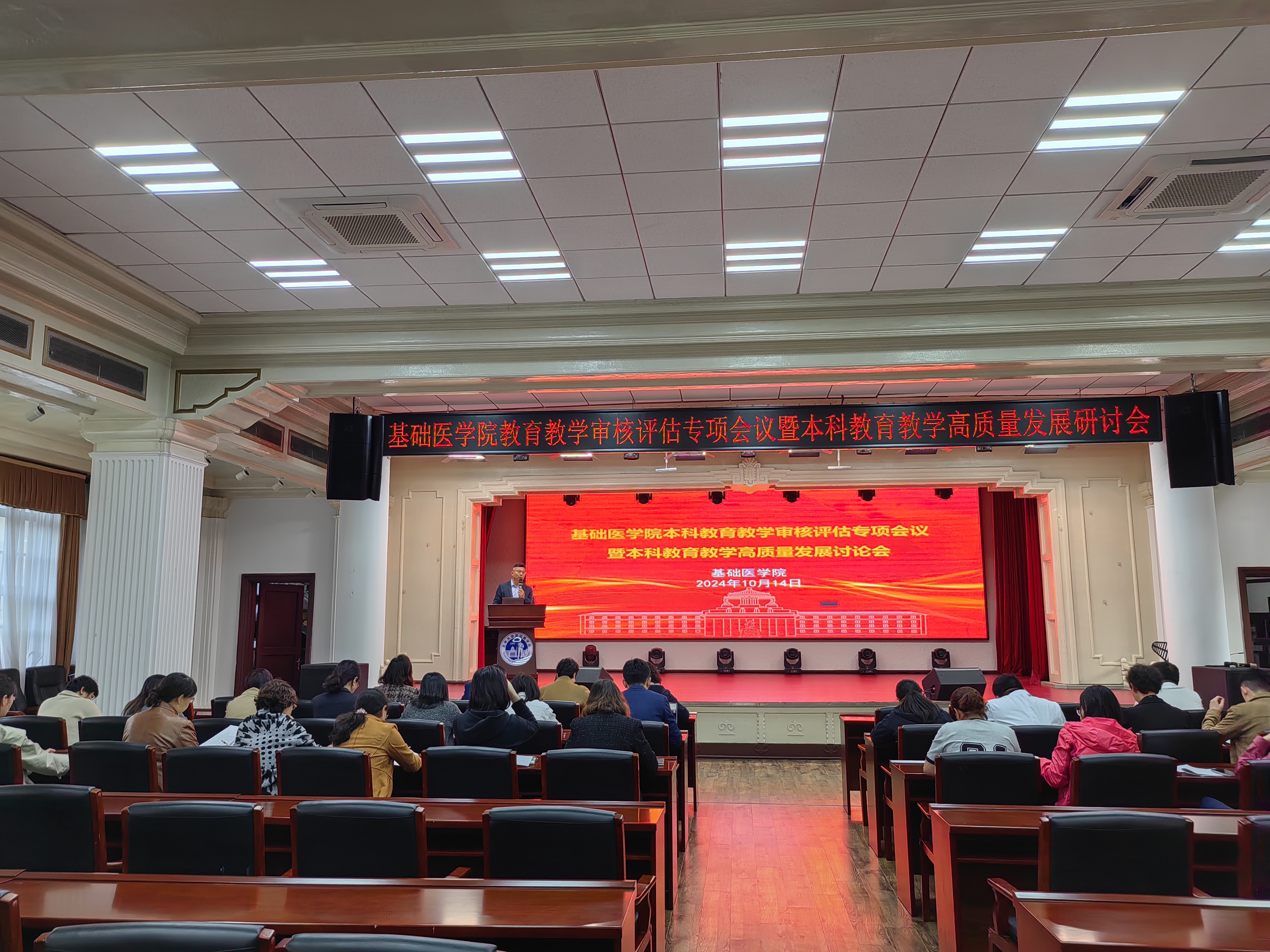 为深入落实立德树人根本任务,提高人才培养质量,全面做好本科教育教学审核评估迎评工作,Galaxy银河于2024年10月14日下午在基础楼二楼学术报告厅召开本科教育教学审核评估专项会议暨本科教育教学高质量发展研讨会。会议由学院院长王放教授主持,学院党政领导班子、学院教学委员会委员、学院教学督导组、各学系(教研室)主任及教师代表40余人出席此次会议。