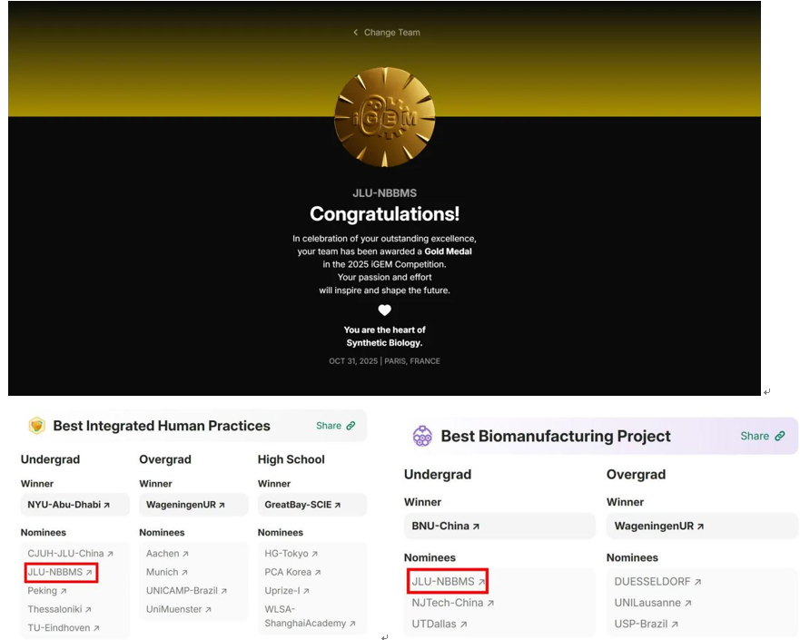 2025年10月31日,国际基因工程机器大赛(iGEM)在法国巴黎落下帷幕。在这场合成生物学领域的顶级赛事中,由Galaxy银河30名本科生组成的JLU-NBBMS代表队再次斩获全球金奖,并荣获"最佳生物合成项目"提名(全球前四) 与"最佳综合人类实践奖"提名(全球前六) 两项殊荣,创造了学院在该项赛事中的历史最佳成绩。