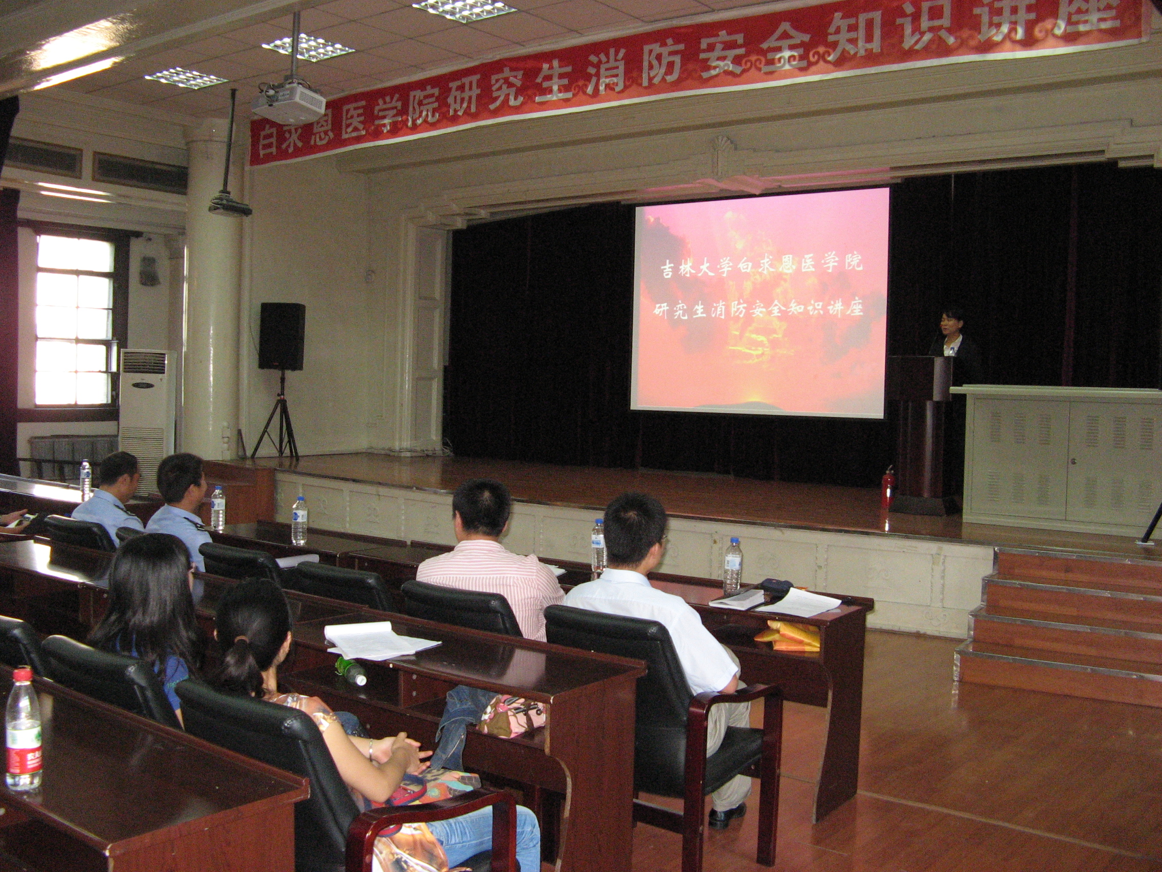 8月31日下午,白求恩医学院邀请新民校区保卫办科长安志成老师和郭云秀老师在基础二楼多功能报告厅为2010级研究生新生进行了消防安全知识讲座。学院党委副书记费淑波、研究生办公室主任陈野、新民校区保卫办两位老师和2010级全体研究生共同听取了此次讲座。讲座由学院研究生会主席杨晓春主持。