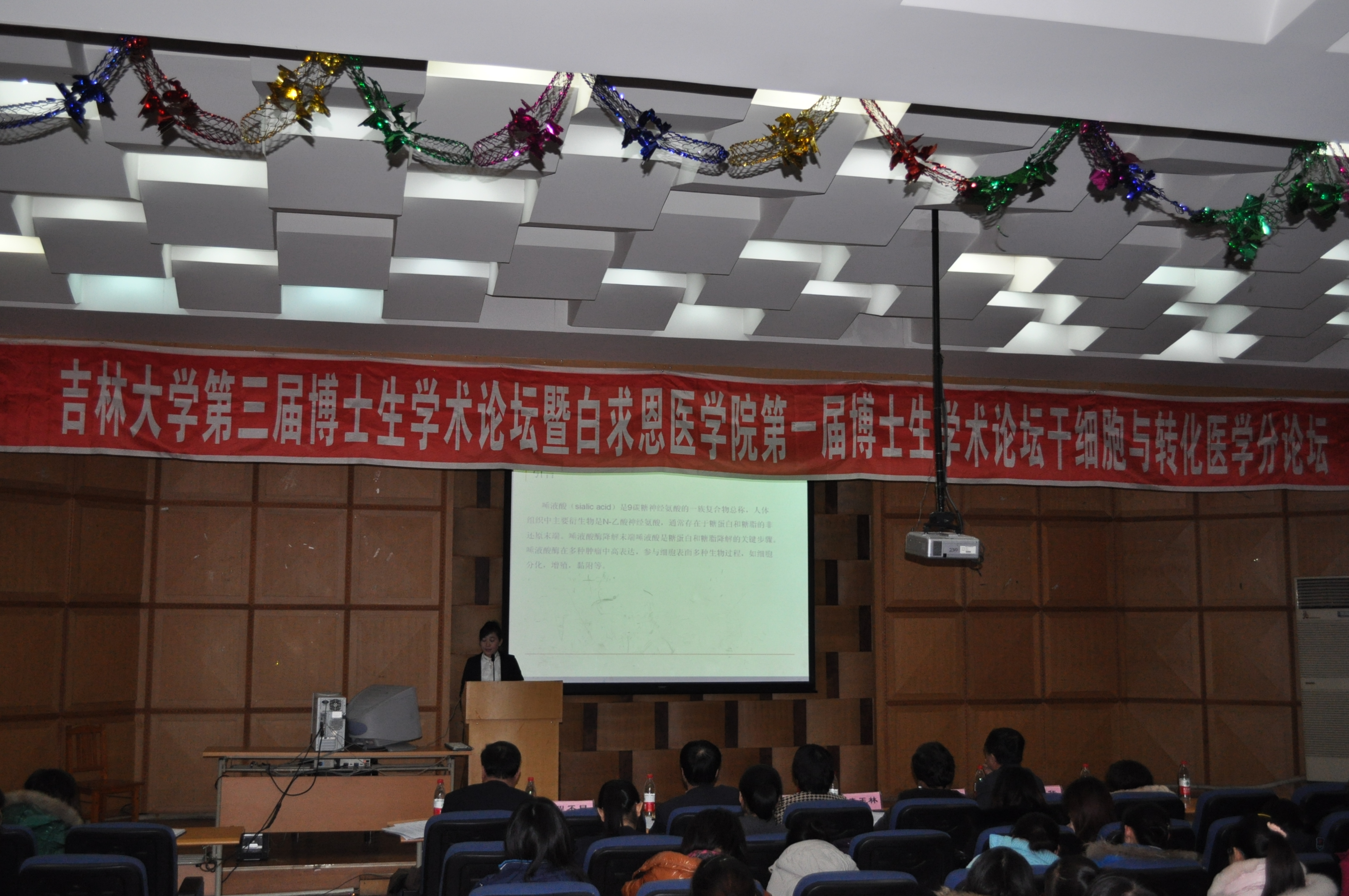 12月16日下午,吉林大学第三届博士生学术论坛暨白求恩医学院第一届博士生学术论坛——干细胞与转化医学分论坛”在新民校区第一教学楼报告厅举行。原吉林大学常务副校长、白求恩医学院院长李玉林,医学部学位委员会主席、学院常务副院长孙连坤,学院党委书记屈英和,基础医学学位评定分委员会主席王丽颖,学院学术委员会主任委员赵华,副院长李一雷、程丕显,副书记费淑波,学院研究生办公室的全体老师和在读研究生一起参加了论坛。