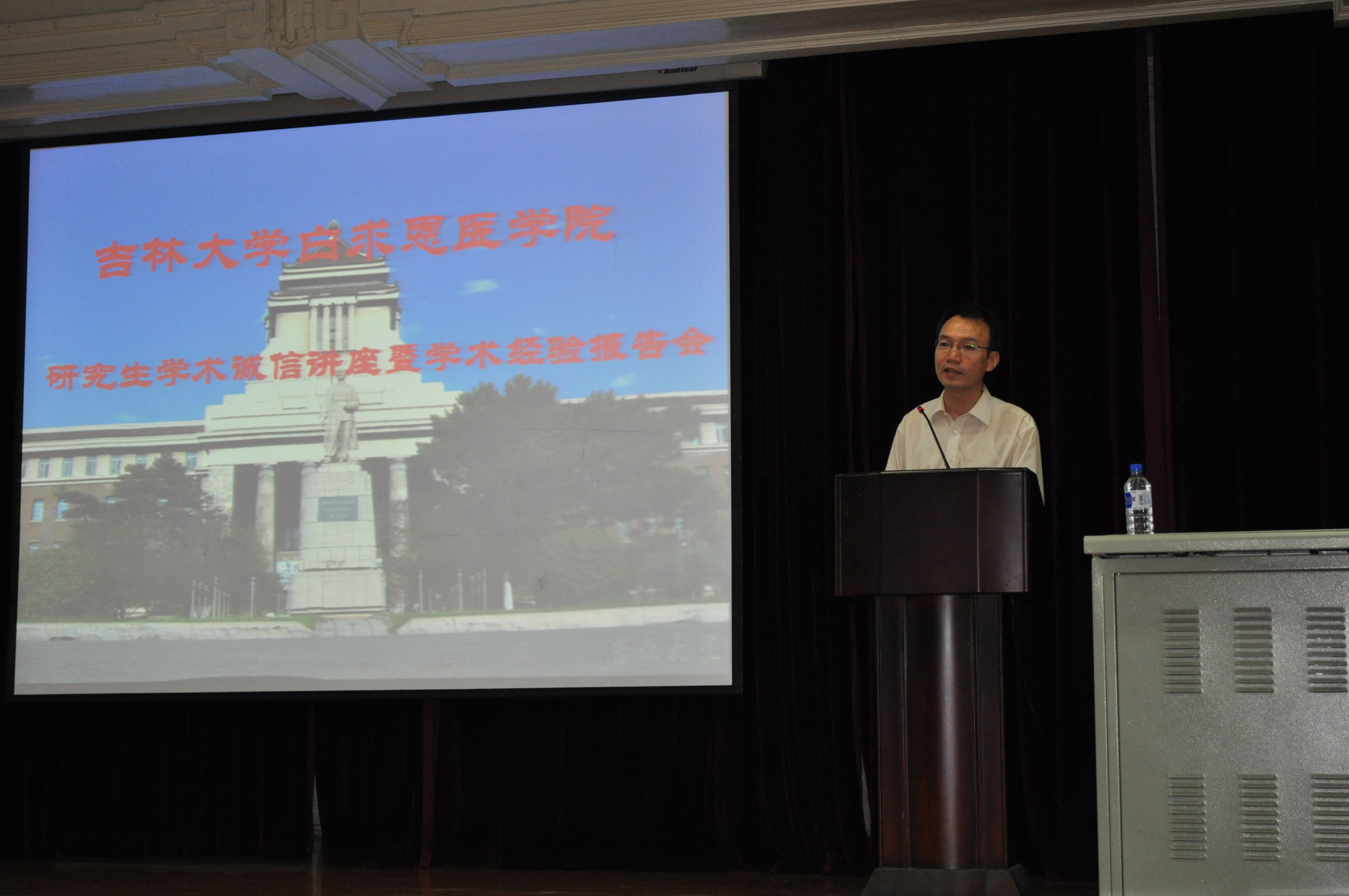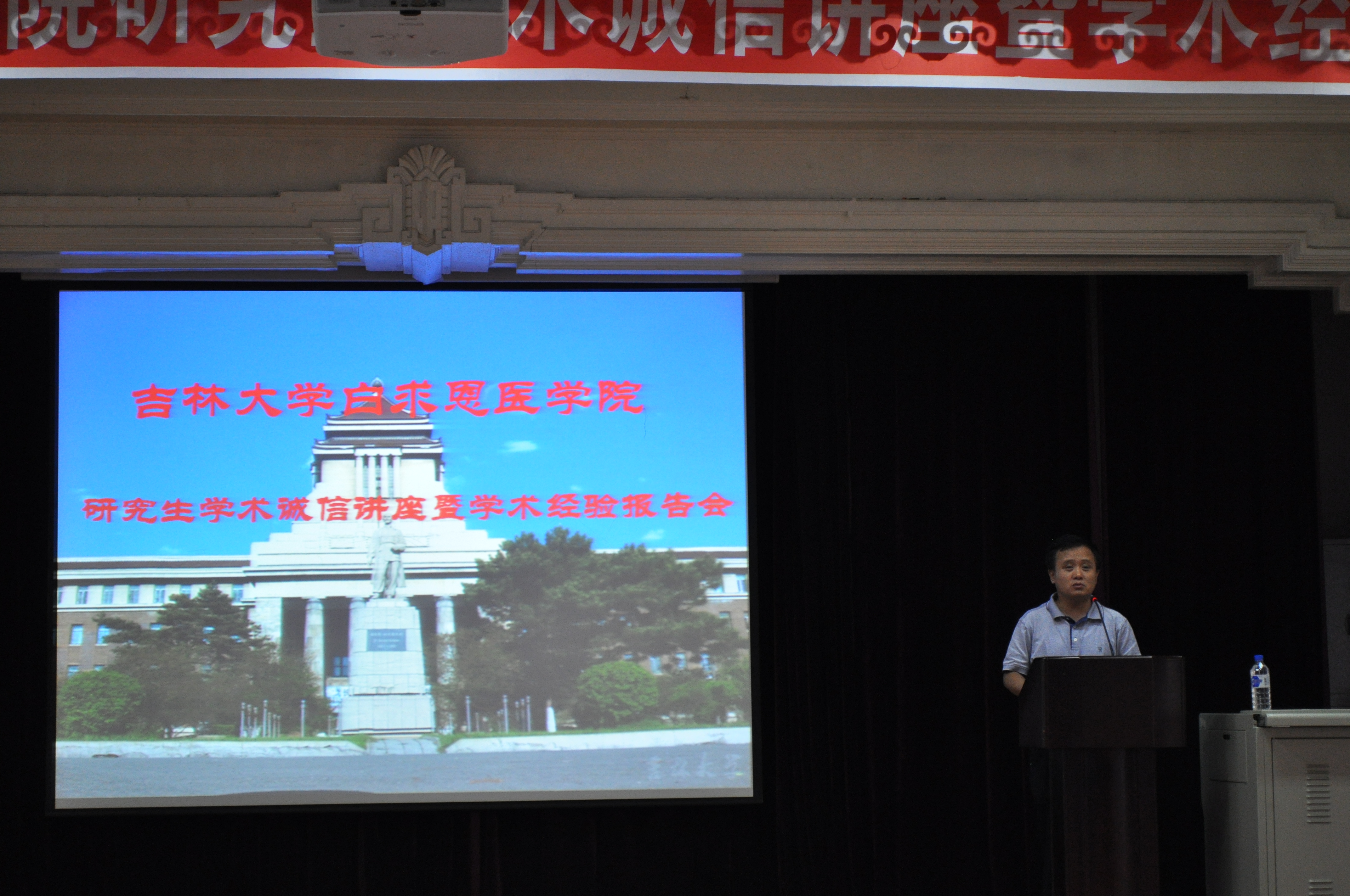 首先,原吉林大学常务副校长、白求恩医学院院长李玉林教授强调了学术诚信的重要意义,希望研究生从自身做起,多向导师和师兄师姐学习经验,坚定学术诚信,不能做违反职业道德的事情,以白求恩为榜样,精益求精做科研、做学问。随后,李桐忠老师通过详实的案例分析,阐述了学术不端行为产生的严重影响和不良后果,并重点强调了有关学术诚信的文件。希望广大研究生诚实做人,勤奋做事,成为国家的栋梁之才。之后,孙连坤教授从院领导和导师角度出发,语重心长的对广大研究生提出了严格的要求,并希望同学们认真钻研,认真积累,正确处理好理想与现实的关系,提高个人的综合素质,争取成为真正的研究型人才。最后,李一雷教授在严谨学术和严格训练,学会工作,规划人生三方面对广大研究生提出希望,并给予具体指导。